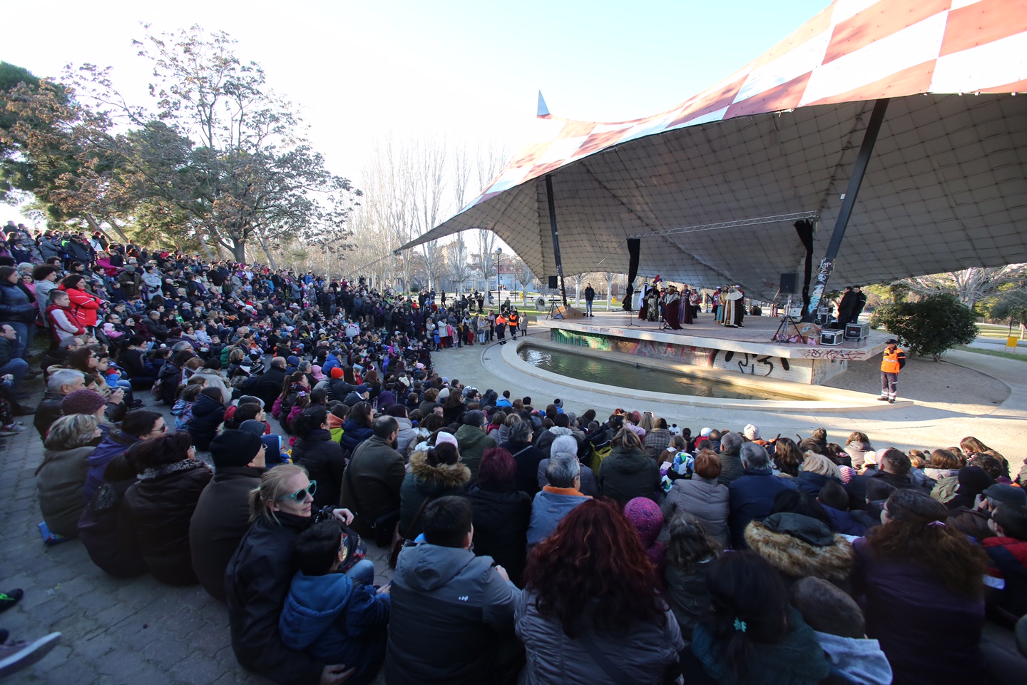 Sus Majestades los Reyes Magos han llegado puntuales a Zaragoza. A las 16,15 horas han aparecido en el Parque de la Paz, donde les estaba esperando el consejero de Economía y Cultura, Fernando Rivarés, acompañado por la vicealcaldesa, Luisa Broto. Desde el anfiteatro del parque Sus Majestades de Oriente han saludado a las más de 3.000 personas que han acudido a recibirles. Han aprovechado también para recoger las cartas que los niños y niñas zaragozanas han querido entragarles en persona.