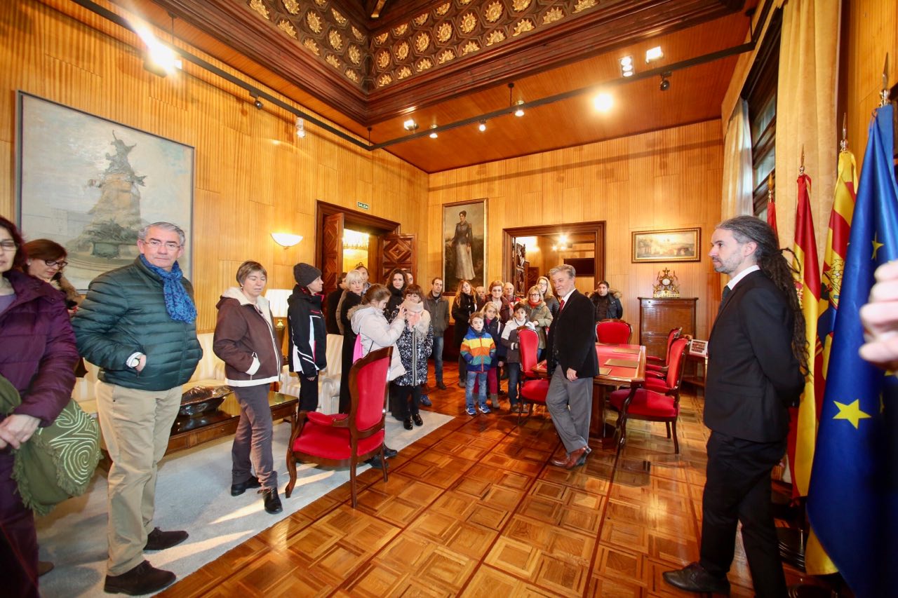 Unos de los actos con mayor afluencia han sido las visitas guiadas al Ayuntamiento, que se han realizado desde las 10.00 horas en horario ininterrumpido hasta las 20,00 horas, donde la ciudadanía ha podido conocer distintas dependencias municipales, como el Salón de Recepciones, la galería de Alcaldes de Zaragoza, la galería de Reyes Aragoneses, la Sala de Prensa, el Salón de Plenos, la Sala de Gobierno, el despacho del alcalde y curiosidades, como los artesonados y techumbres mudéjares del siglo XV procedentes del desaparecido Palacio de los Marqueses de Osera, el busto de Goya (de Benlliure y Gil, 1904) o el cuadro de Agustina de Aragón (de Agustina Atienza, 1882).