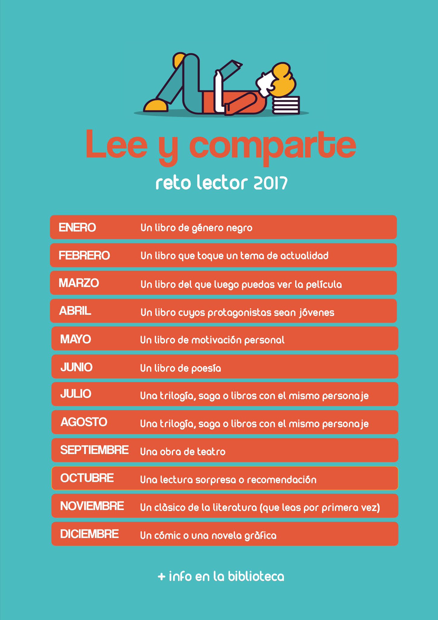 La Biblioteca para Jóvenes Cubit pretende así dinamizar la lectura entre sus socios y usuarios, y también entre muchos otros seguidores que se hayan marcado leer más entre sus propósitos para el año 2017. El reto no solo consiste en leer un libro de cada categoría establecida, sino en compartirlo en las redes sociales bajo la etiqueta #LeeYComparte.
