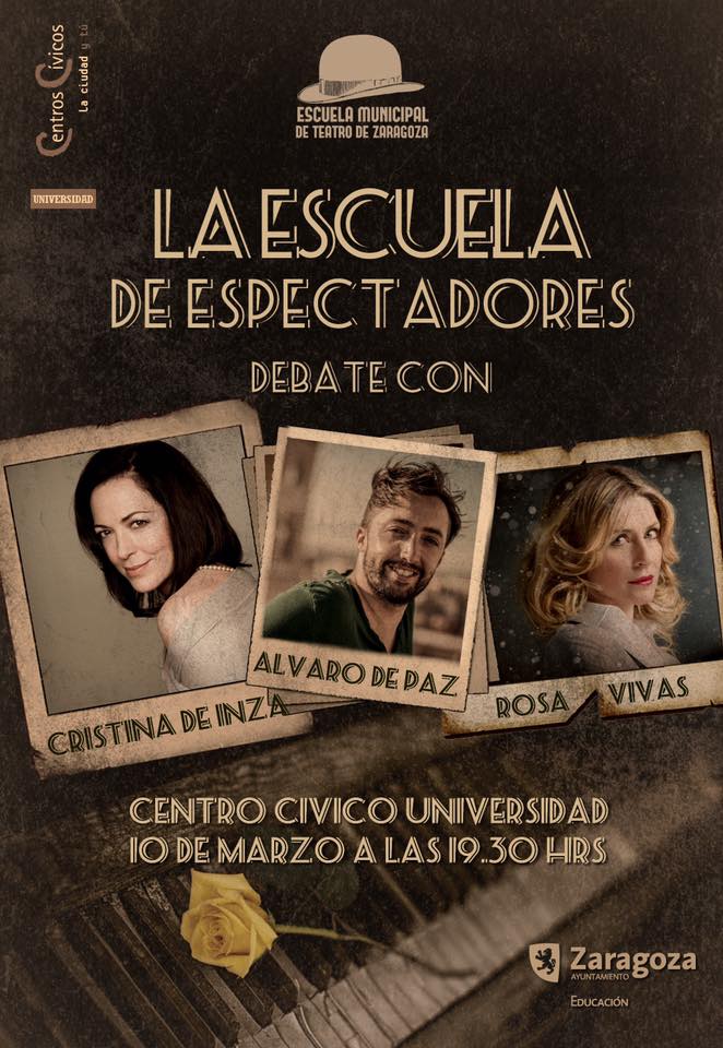 La Escuela Municipal de Teatro del Ayuntamiento de Zaragoza atesora más de treinta años de experiencia en la formación de jóvenes actores y actrices, algunos de los cuales se han abierto camino con una exitosa carrera en el teatro, el cine o la televisión. Es el caso de Cristina de Inza, Rosa Vivas y Álvaro de Paz, que mañana viernes 10 de marzo volverán a sus orígenes para debatir y compartir sus experiencias profesionales en el Centro Cívico Universidad, a partir de las 19,30 horas.