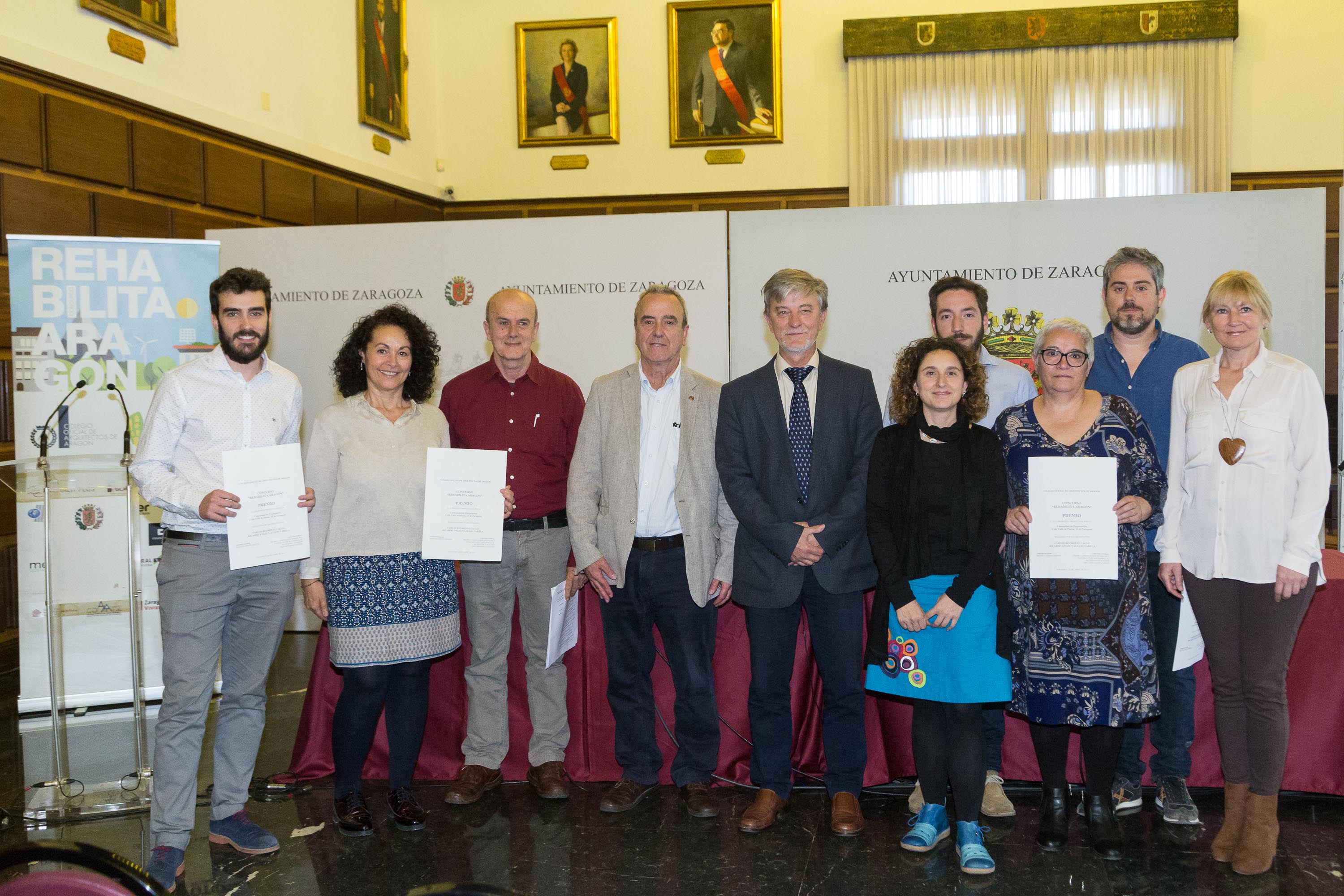 En la Jornada, el alcalde de Zaragoza, Pedro Santisteve, y el presidente del Colegio Oficial de Arquitectos de Aragón, Ricardo Marco, han hecho entrega del Premio Rehabilita Aragón a la comunidad de propietarios de calle Pineta 16 de Zaragoza, cuyo edificio pertenece al Conjunto Urbano de Teniente Ortiz de Zárate en el sector del Picarral.