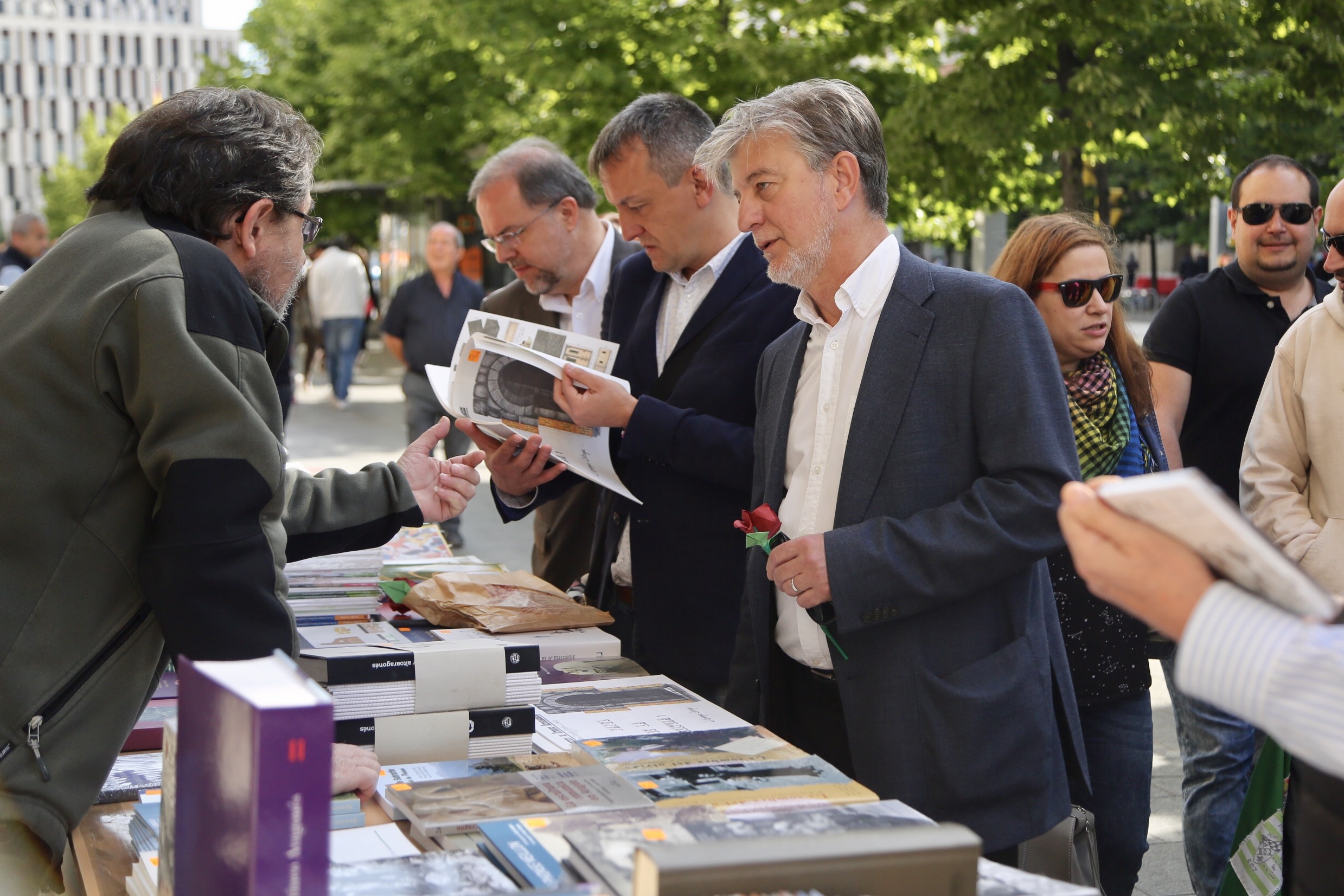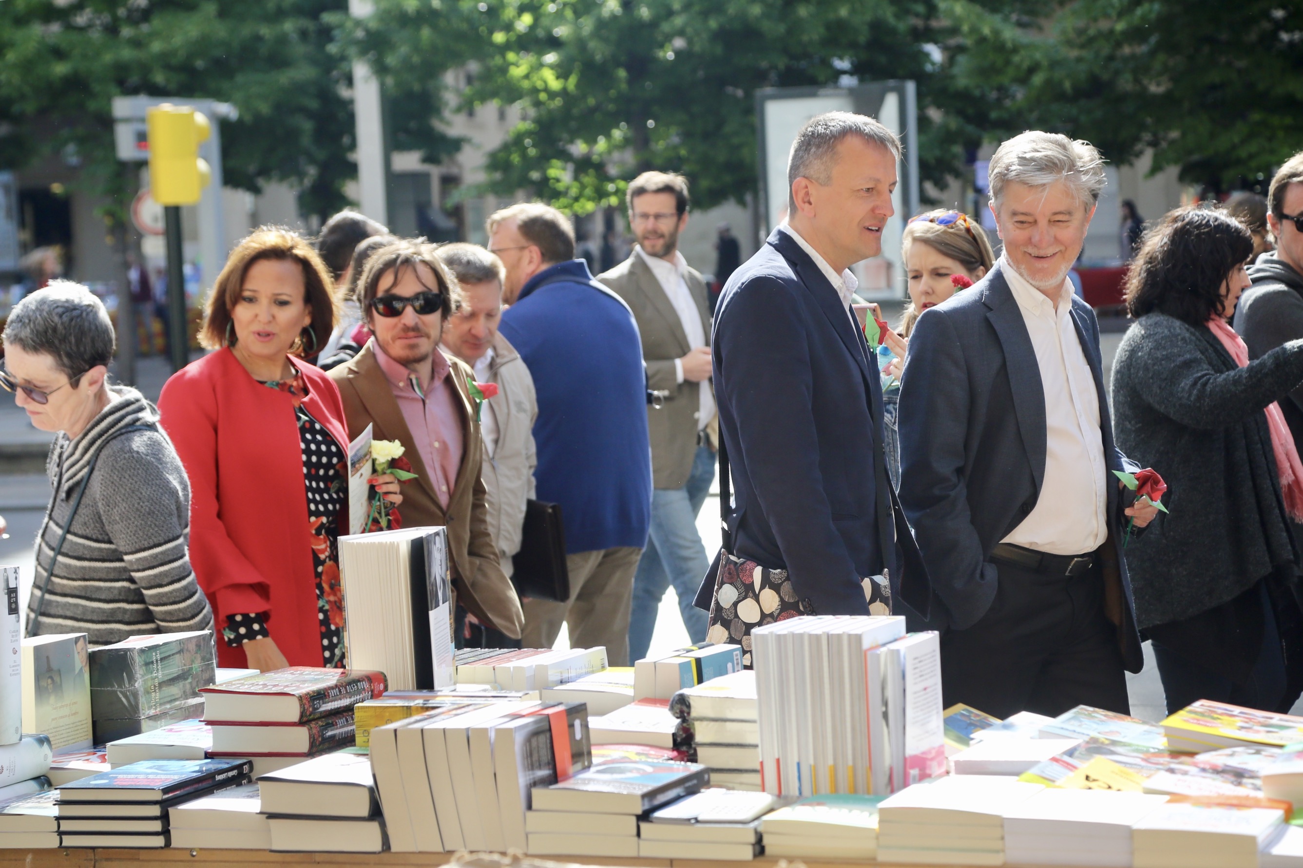 Zaragoza se suma este 23 de Abril a la conmemoración del Día de Aragón celerando el Día del Libro en los porches del Paseo de la Independencia. El alcalde de Zaragoza, Pedro Santisteve, acompañado del consejero de Economía y Cultura, Fernando Rivarés, ha recorrido esta mañana los puestos de libros que las editoriales y las librerías aragonesas han colocado en los porches del Paseo de la Independencia, donde han departido con autores y libreros, así como con el público que ha acudido a conocer las últimas novedades editoriales y a disfrutar de una soleada mañana dedicada a la cultura y a los libros. En este recorrido, las autoridades municipales han estado acompañadas con la consejera de Educación, Cultura y Deporte del Gobierno de Aragón, Maite Pérez, por el director general de Cultura, Nacho Escuín, y por el diputado de Cultura de la Diputación Provincial de Zaragoza, Chesús, Yuste.
