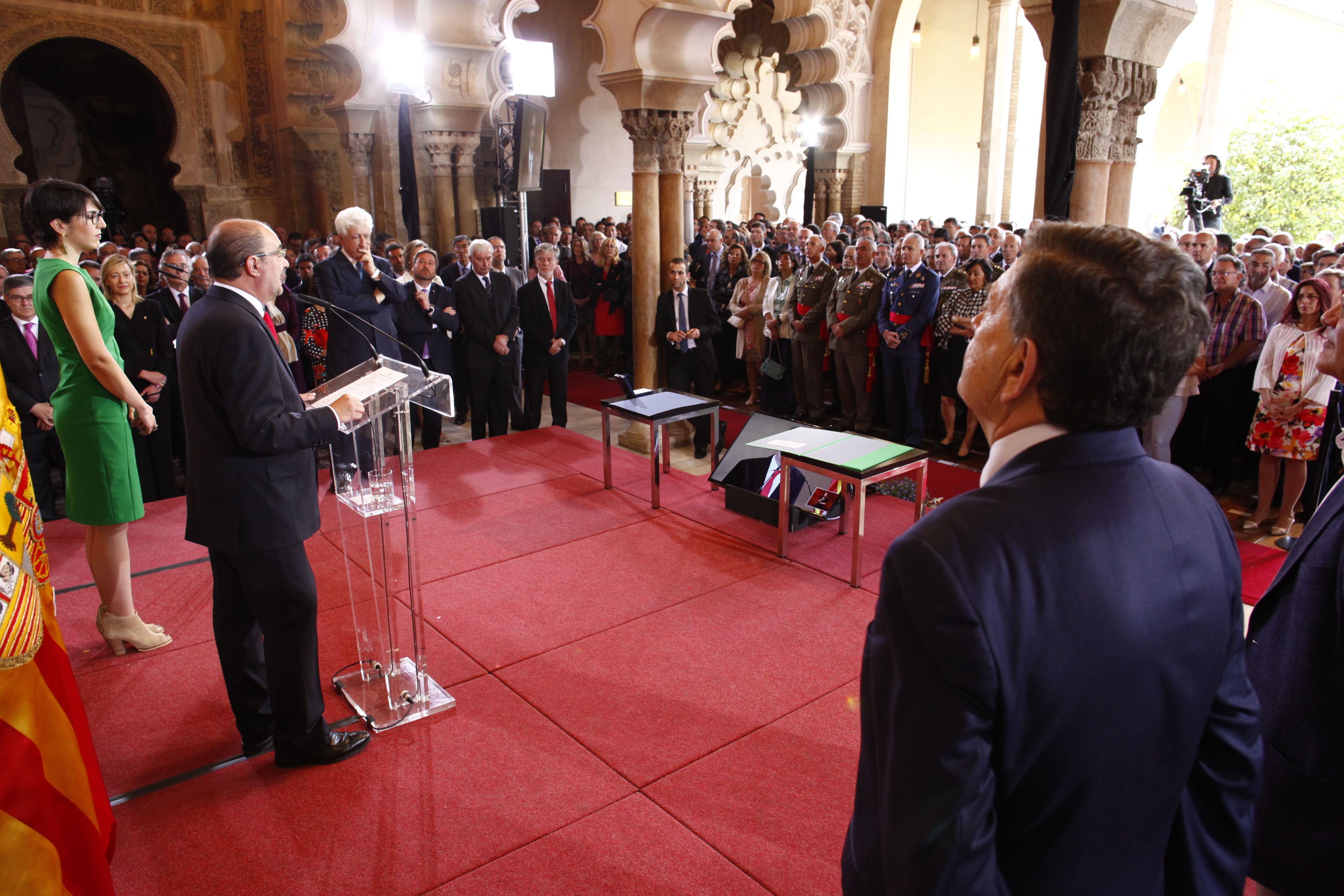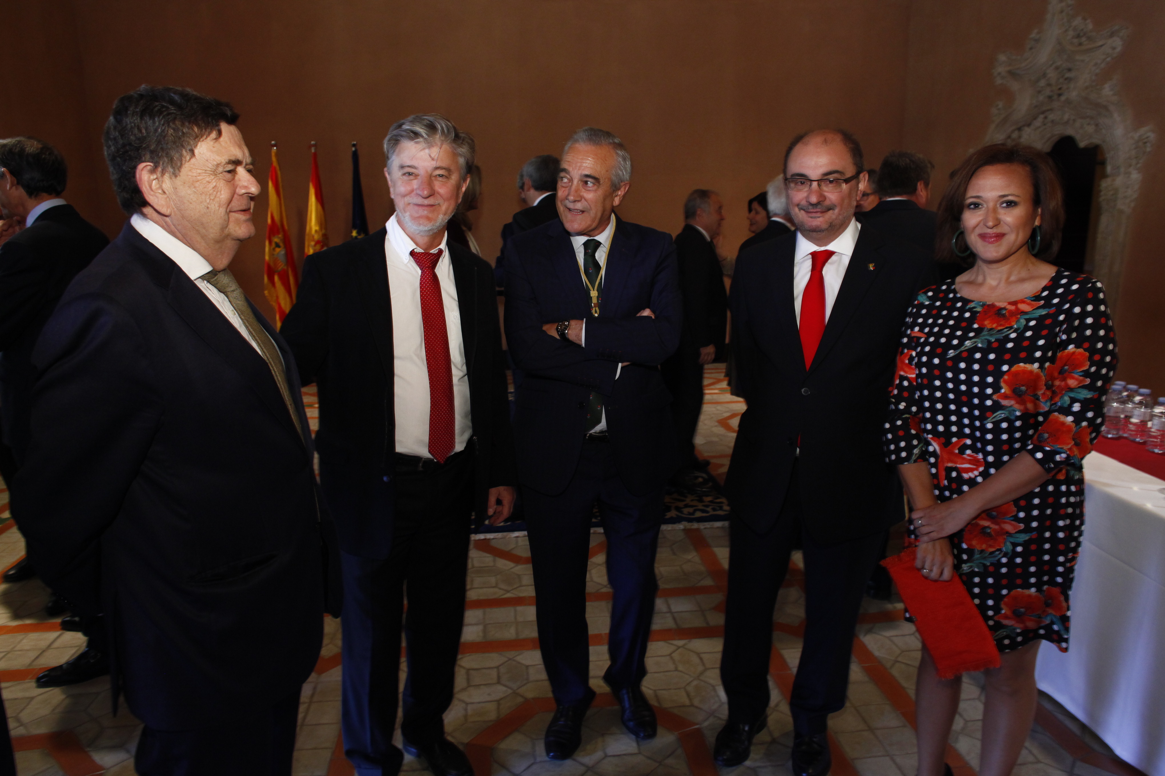 Posteriormente, el alcalde, acompañado de la vicealcaldesa, Luisa Broto, se ha desplazado al Palacio de la Aljafería, en cuyo Patio de los Naranjos ha tenido lugar el acto oficial y la recepción que, con motivo de la celebración del 23 de Abril, han ofrecido a los representantes de la sociedad aragonesa las Cortes de Aragón y el Gobierno de Aragón. En este acto, ambas institucionaes han otorgado sus máximos galardones anuales: la Medalla de las Cortes de Aragón a la Ronda de Boltaña, la Medalla de la Educación Aragonesa al CEIP de Alpartir, y el Premio Aragón al ex rector de la Universidad de Zaragoza, Manuel López.