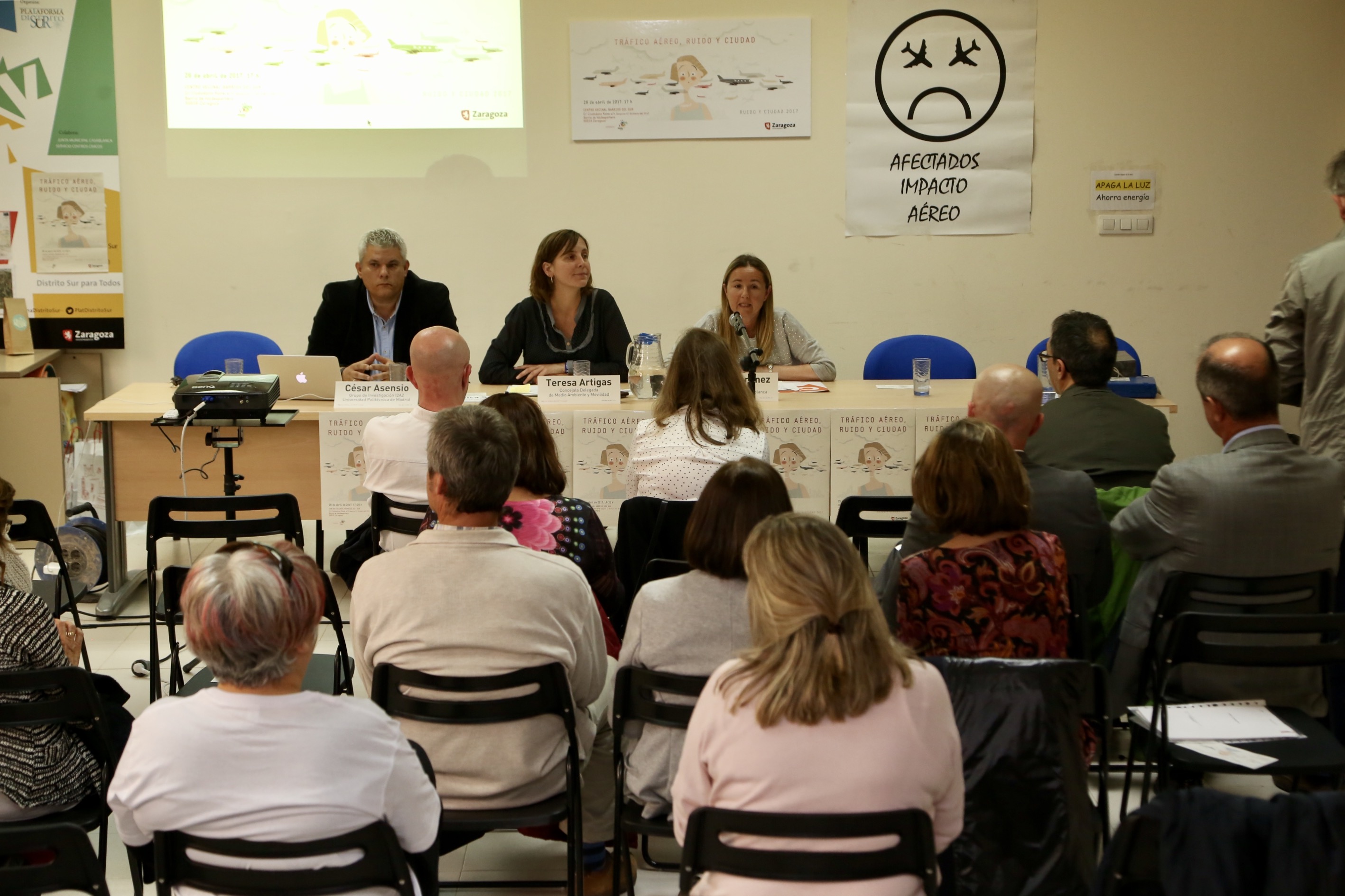 En dicha Jornada han intervenido especialistas en ruido tanto de la Universidad Politécnica de Madrid como del Grupo de Vibroacústica de la Universidad de Zaragoza, representantes de AENA y de la Base Aérea de Zaragoza, así como de la Plataforma Distrito Sur y de la Asociación de Afectados por el Impacto del Tráfico Aéreo.