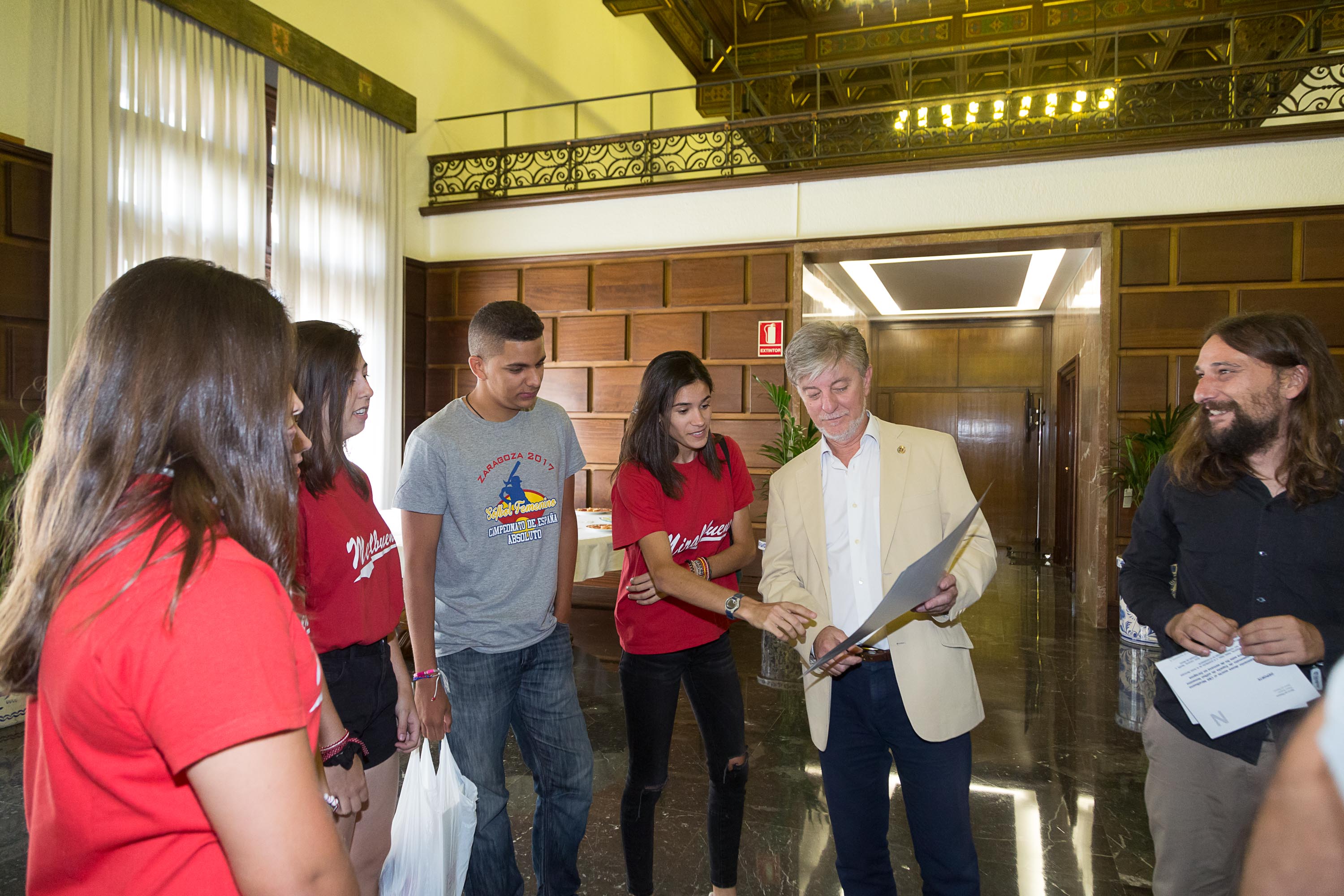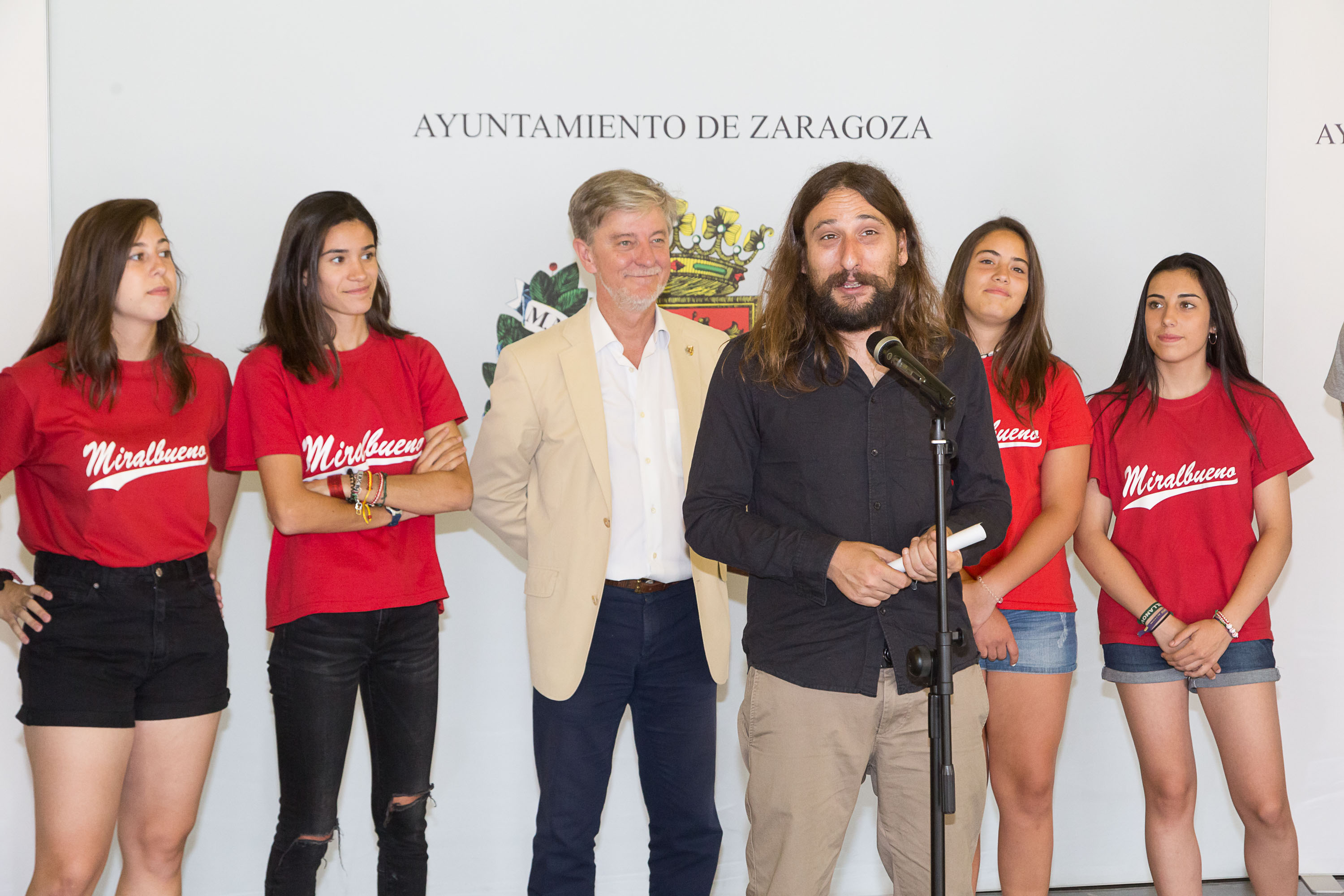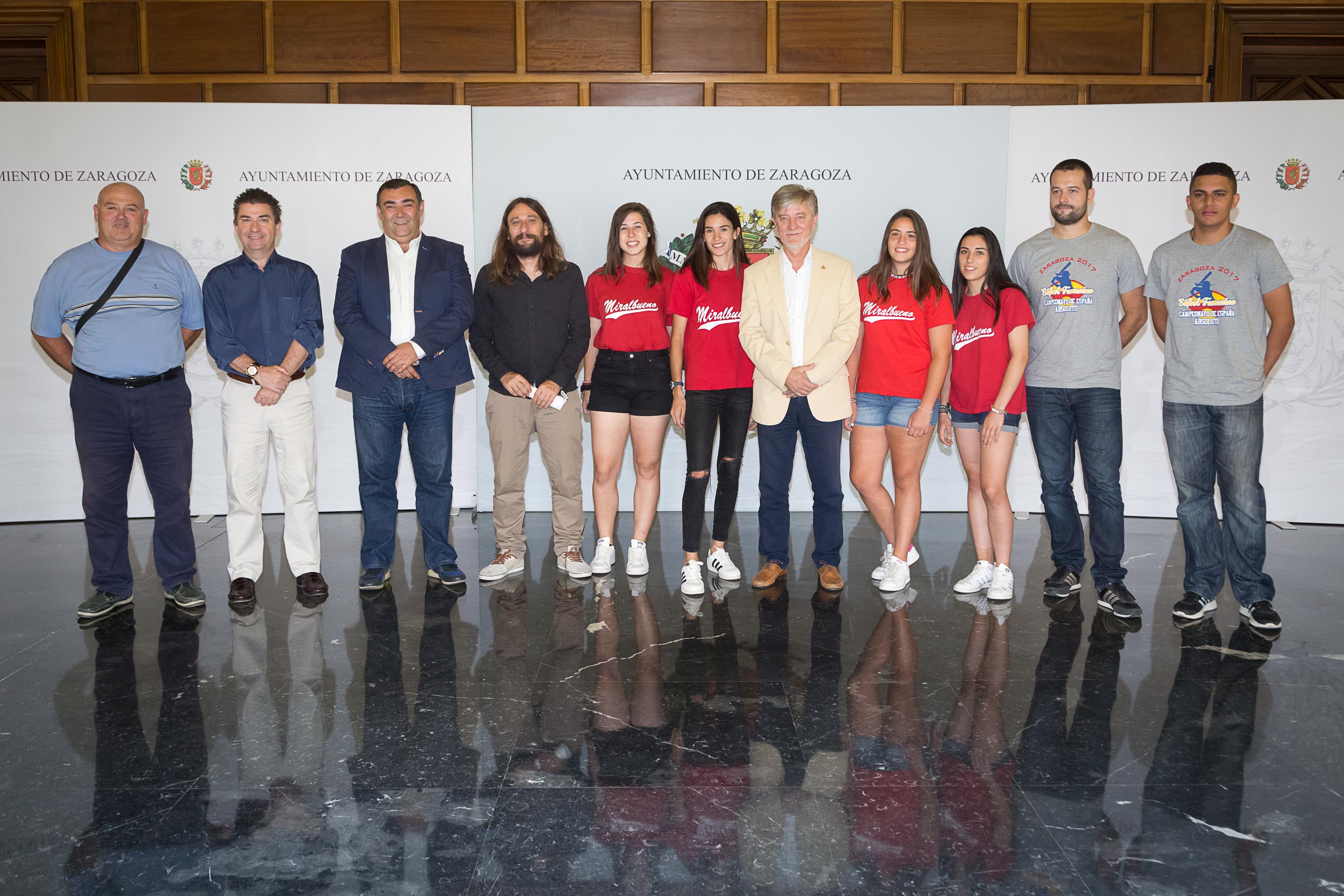 El alcalde de Zaragoza, Pedro Santisteve, y el concejal de Deporte, Pablo Híjar, han recibido hoy al equipo femenino del Club Béisbol y Sófbol Miralbueno, al que ha deseado suerte en el Campeonato de España que se va a celebrar este fin de semana en Zaragoza. En la recepción también ha participado el concejal Alberto Casañal, del grupo municipal de Ciudadanos, como presidente de la Junta Municipal de Miralbueno.