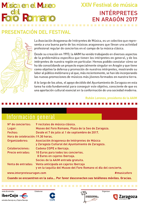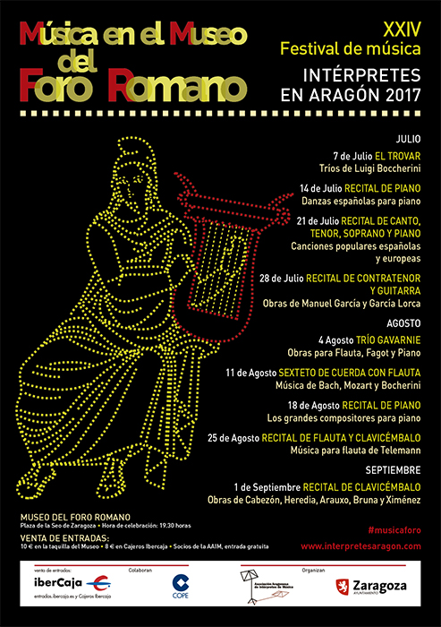 Continúa durante este mes de agosto la programación de recitales en el Museo del Foro Romano, que ha organizado el Ayuntamiento de Zaragoza junto con la Asociación Aragonesa de Intérpretes de Música, colectivo que representa a una gran parte de los músicos aragoneses que llevan una actividad profesional regular de conciertos en el ámbito de la música clásica.
