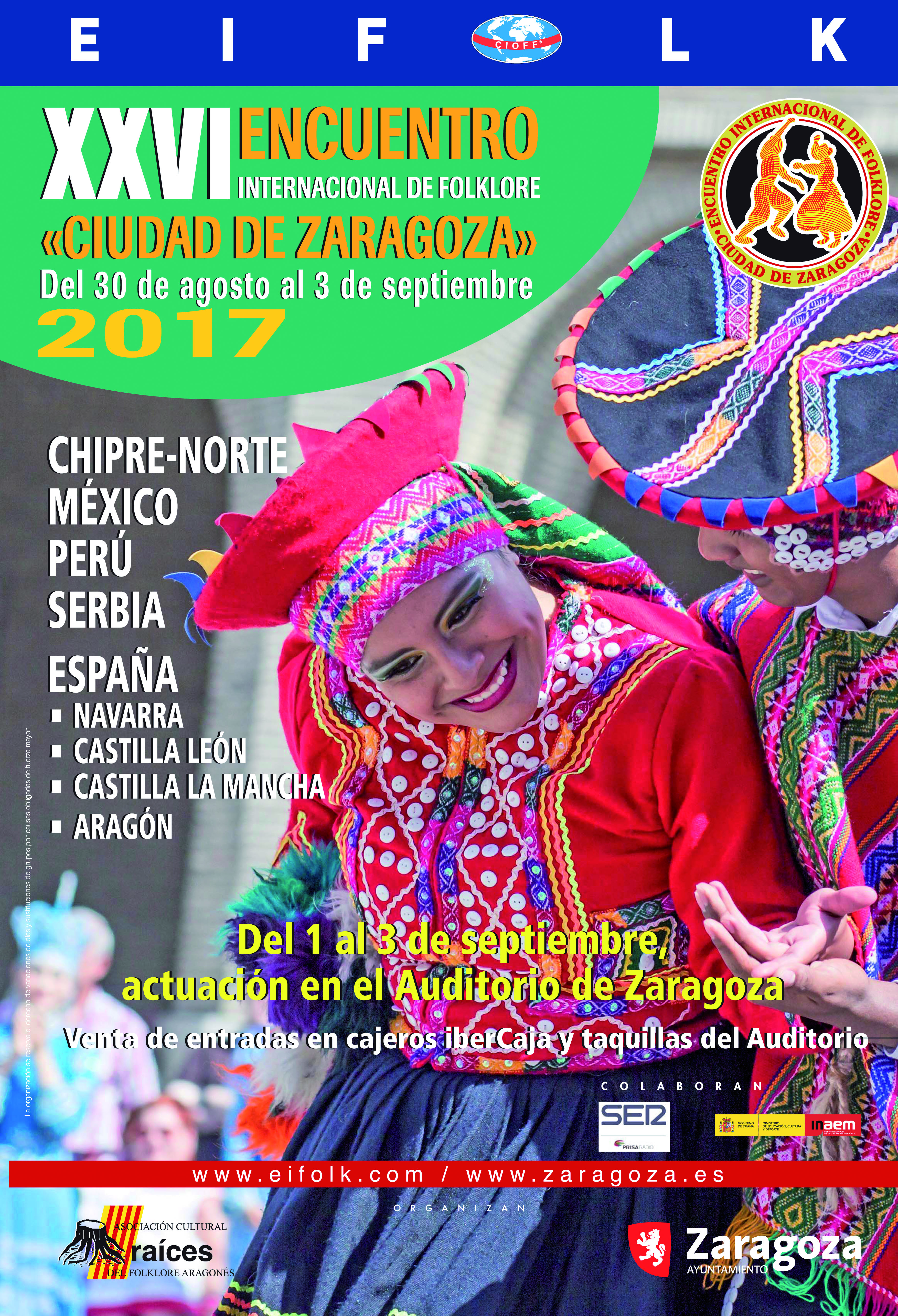 Zaragoza se convertirá la próxima semana en punto de encuentro del folklore internacional. Durante cuatro días, en nuestra ciudad se darán cita agrupaciones procedentes de cinco países para participar en el XXVI Encuentro Internacional de Folklore 'Ciudad de Zaragoza'  EIFOLK-2017.