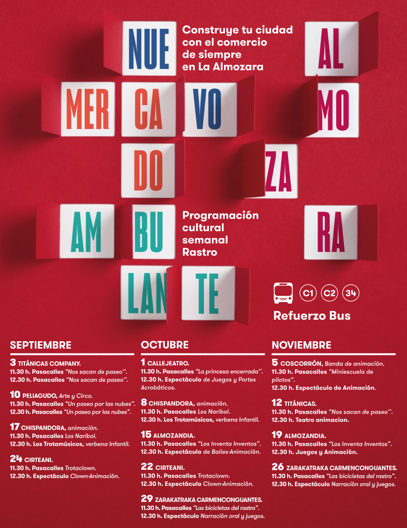 El mercado de La Almozara/Rastro relanza su actividad a partir de este fin de semana con la puesta en marcha de un programa de actividades culturales y lúdicas. Organizadas por el Ayuntamiento de Zaragoza, todos los domingos de septiembre, octubre y noviembre habrá pasacalles, actuaciones teatrales o de animación.