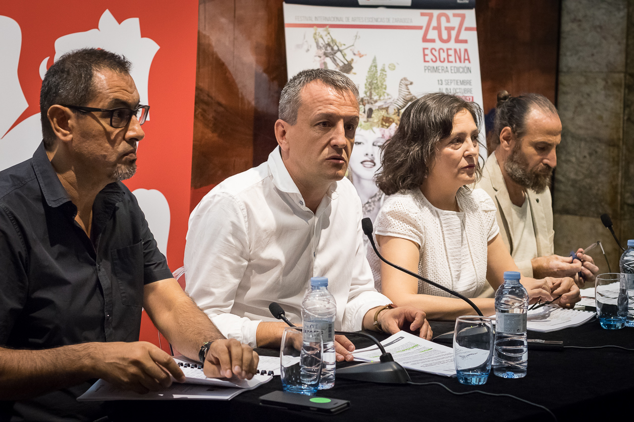 El consejero de Economía y Cultura del Ayuntamiento, Fernando Rivarés, y el gerente del Patronato Municipal de las Artes Escénicas y de la Imagen (PMAEI), Víctor López, acompañados por los representantes de las Asociaciones Aragonesas de Empresas de Artes Escénicas Cristina Yáñez (Asemtar) y Carlos Martín (Ares Aragon Escena), han presentado la programación de la primera edición del Festival Internacional Zaragoza Escena, que se celebrará del 13 de septiembre al 1 de octubre de 2017.