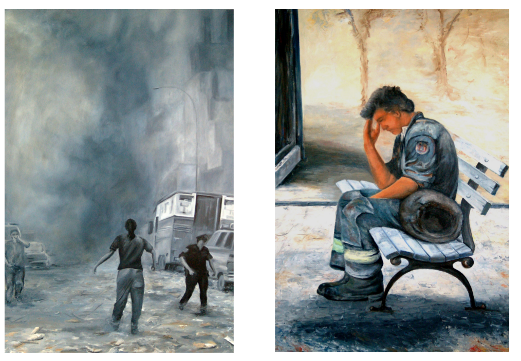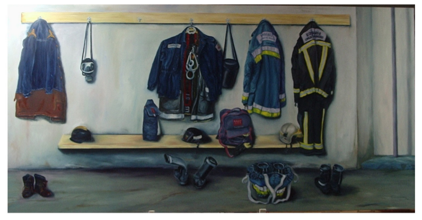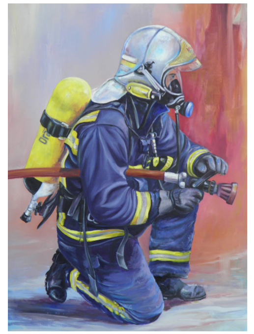 La muestra tiene como obra principal un gran cuadro en el que aparecen un grupo de bomberos en pleno trabajo, en el que se realza sobre todo la tensión corporal, el esfuerzo y la concentración que requiere la labor tan importante que desarrollan estos profesionales.