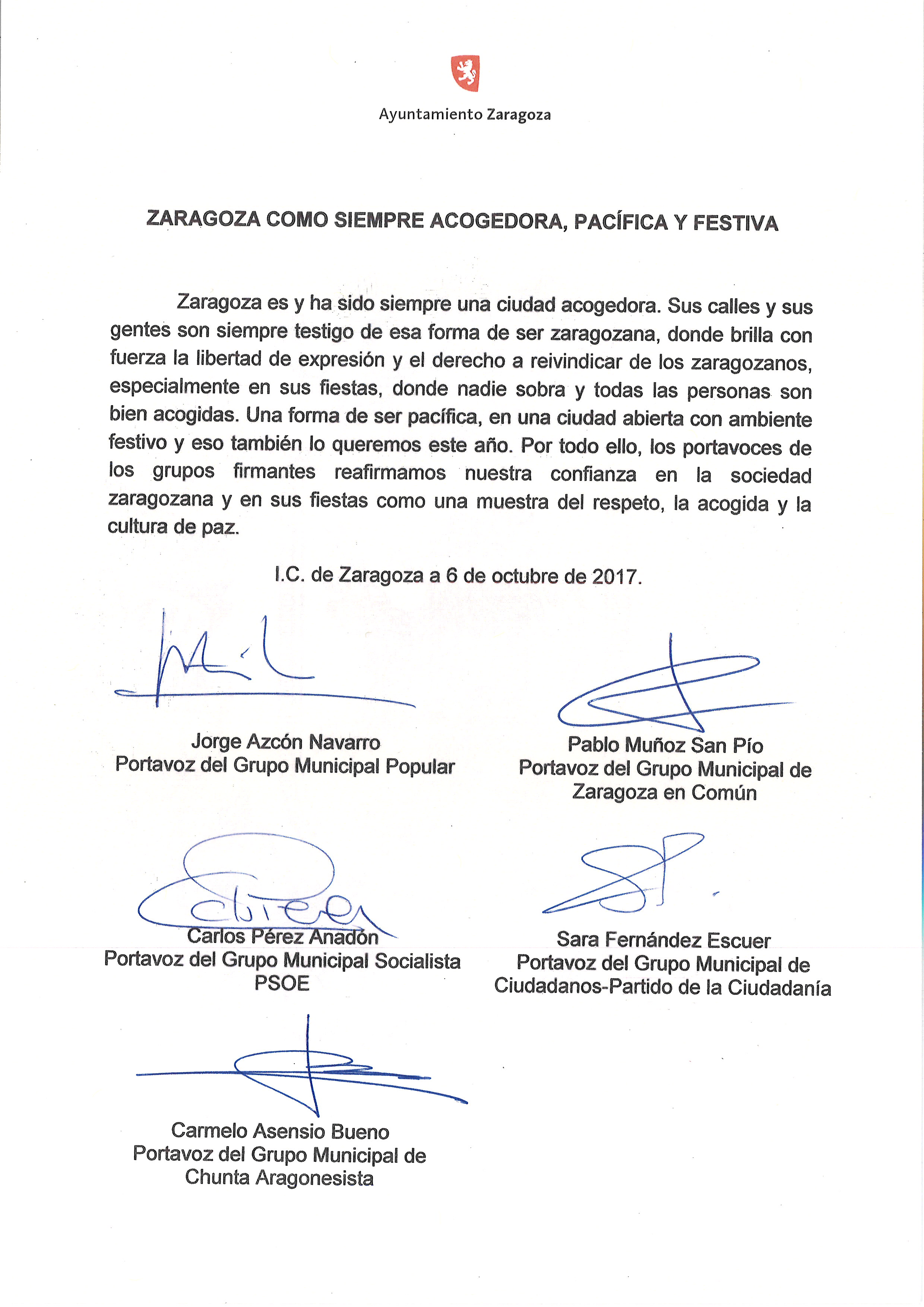 Llamamiento institucional  firmado todos los grupos políticos en la Junta de Portavoces celebrada hoy viernes, titulado "Zaragoza, como siempre, acogedora, pacífica y festiva".