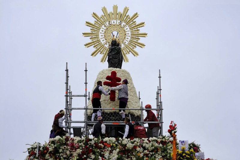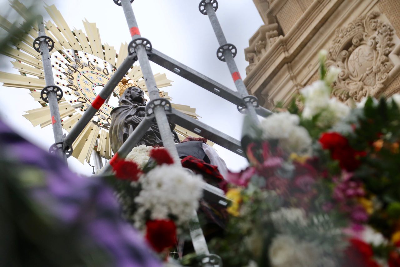 La Virgen del Pilar luce su manto de flores blancas con la Cruz de Lorena