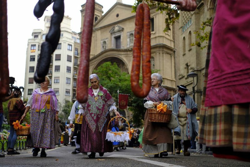Ataviados con sus trajes tradicionales, y entre músicas y bailes típicos de cada comunidad autónoma, los oferentes han recorrido el Paseo Independencia, Plaza España, Coso y calle Alfonso hasta llegar a la Plaza del Pilar. Ahí han depositado sus vistosas cestas de frutas, verduras y productos típicos.