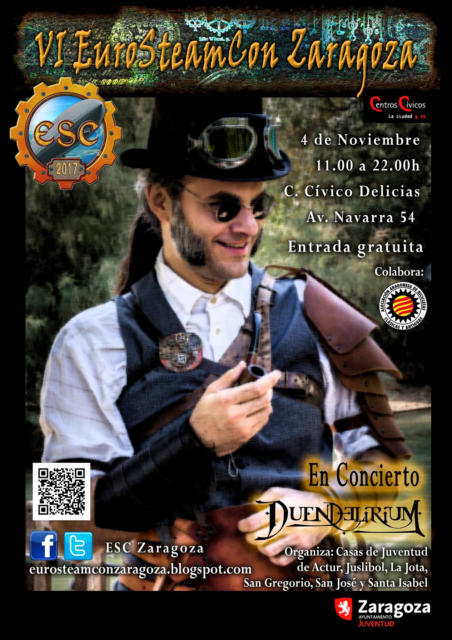 El Centro Cívico Delicias acoge este sábado 4 de noviembre la sexta edición de la convención Eurosteampunk Zaragoza, un evento dedicado a este género cultural y estético, nacido de la literatura, que está revalorizándose por toda Europa. Desde las 11 de la mañana y hasta las 10 de la noche, engranajes, máquinas de vapor, gafas de pilotar o 'goggles' tomarán el protagonismo en esta jornada organizada por el Servicio de Juventud del Ayuntamiento de Zaragoza, a través de las Casas de Juventud de Actur, Juslibol, La Jota, San Gregorio, San José y Santa Isabel.