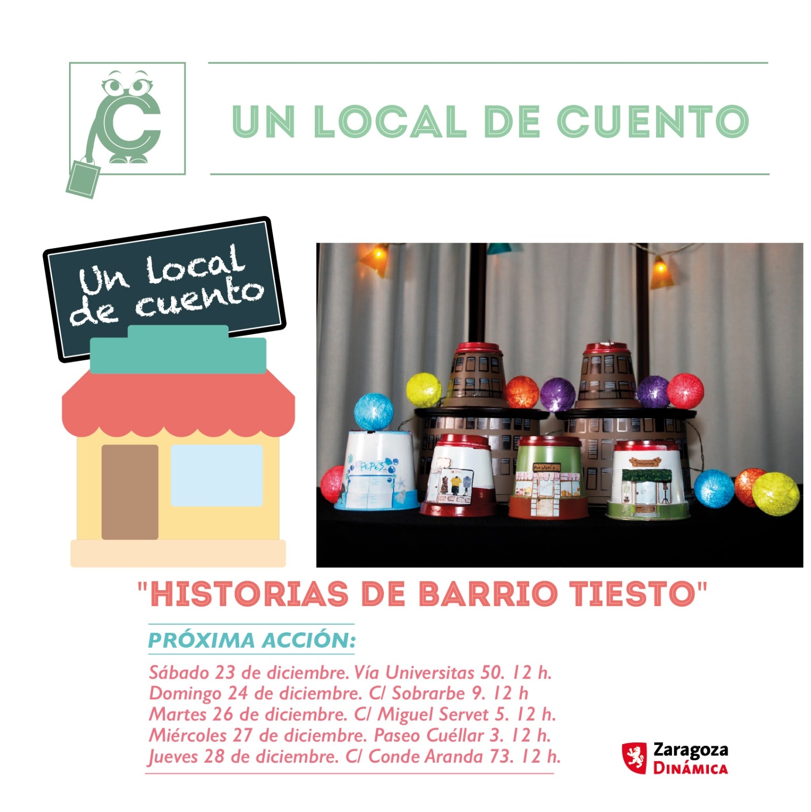 Para estas fechas navideñas, entre el 23 y el 28 de diciembre, el Ayuntamiento de Zaragoza ha organizado un ciclo de actividades de cuentacuentos en locales vacíos de cinco barrios de la ciudad.