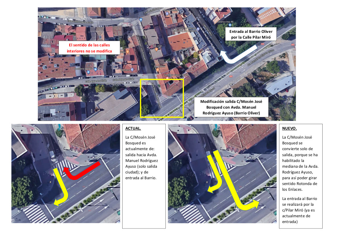 En consecuencia, la entrada por la calle Mosén José Bosqued desde la Avda Manuel Rodríguez Ayuso se anula, quedando la entrada al Barrio Oliver por la calle Pilar Miró, que ya es actualmente de entrada.