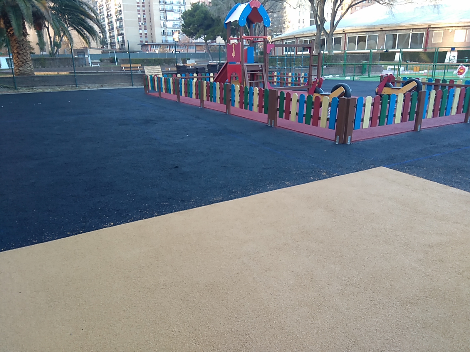 En las piscinas de verano del Palacio de los Deportes se ha reparado la zona de juegos infantiles, que se encontraba muy degradada tras 15 años de uso. Zaragoza Deporte ha acometido una inversión de 30.960,31 euros en una superficie de 529 metros cuadrados para pavimentar con aglomerado de caucho de varios colores esta zona destinada al esparcimiento de los menores. Se ha instalado un pavimento con alta capacidad de absorción de agua, transpiración y resistencia, lo que facilitará su mantenimiento.