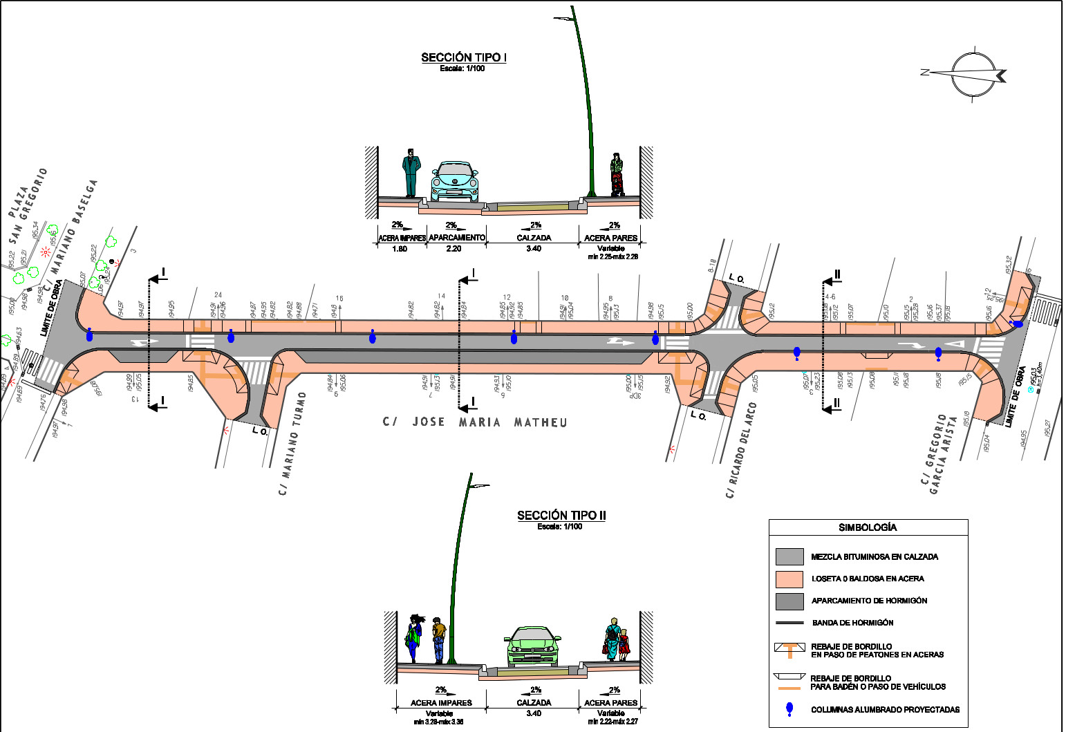 La ejecución de las obras verá afectada además la intersección de la calle Matheu con las calles adyacentes : C/ Mariano Baselga, C/ Mariano Turmo, C/Ricardo del Arco y C/ Gregorio García Arista. La calzada está prevista con un único carril de circulación, con una anchura de 3,40 m. También se proyectan dos aceras de ancho variable, con un paso mínimo superior siempre a 1,80 metros, con anchuras que oscilan entre 2,22 y 2,28 metros en la acera de números pares y entre 1,80 (en la zona de aparcamientos), y 3,36 metros en el lado de números impares. En las intersecciones con las calles adyacentes se adecuarán los cruces peatonales dotándolos de orejetas y aparcamiento (en su caso).