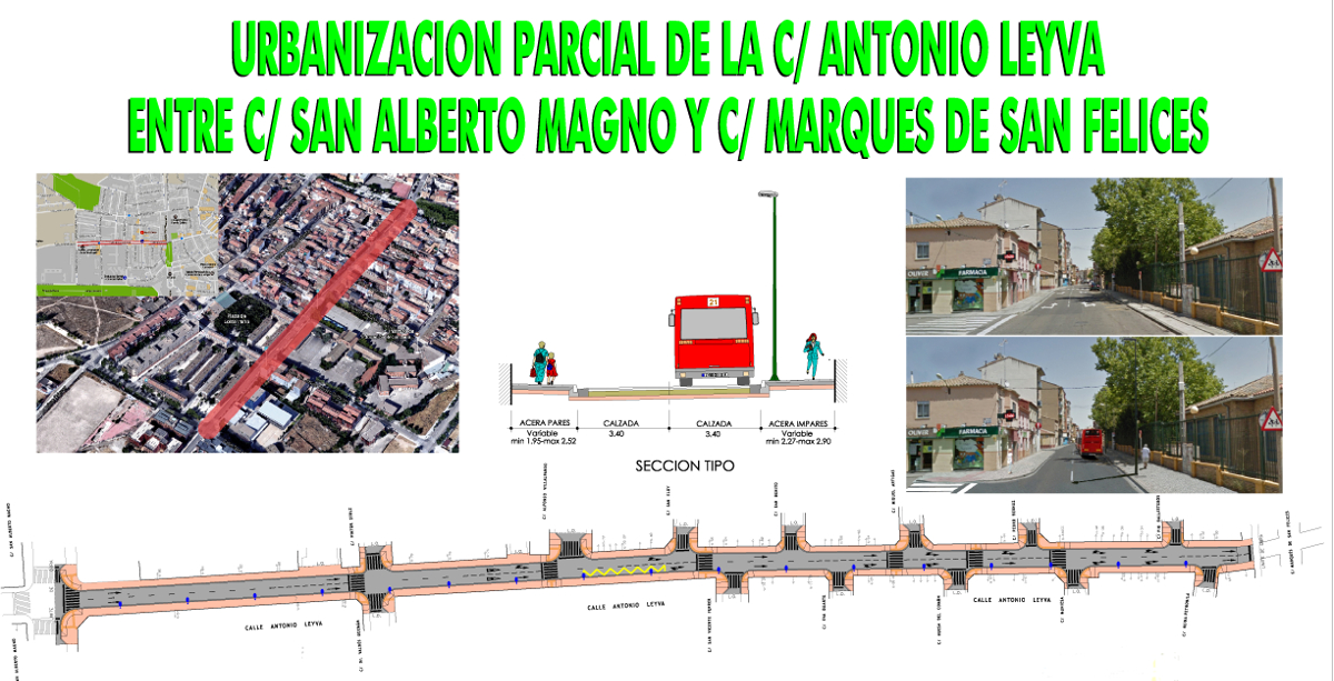 El proyecto, que ha sido redactado por el Departamento de Nuevas Infraestructuras, recoge una nueva definición del viario de la calle Antonio Leyva, que se desarrolla en 444 metros, en el tramo comprendido entre las calles San Alberto Magno y Marqués de San Felices, afectando también a los entronques con quince calles adyacentes.