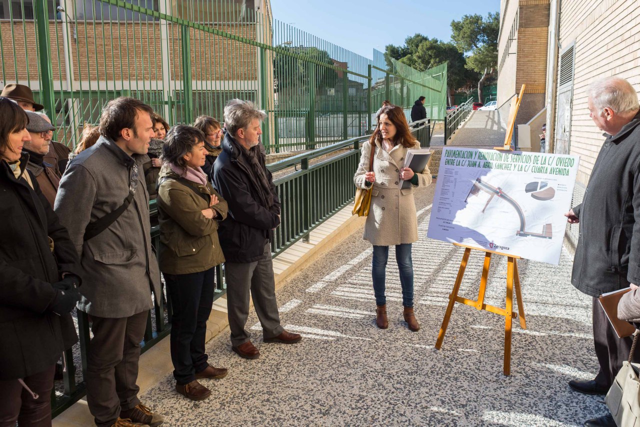 El alcalde de Zaragoza, Pedro Santisteve, acompañado de la vicealcaldesa y presidenta de la Junta de Distrito de Torrero - La Paz, Luisa Broto, y del consejero de Urbanismo y Sostenibilidad, Pablo Muñoz, así como de representantes de las entidades sociales y vecinales, han inaugurado esta mañana la remodelada Calle Oviedo, una de las obras históricamente más demandadas por la ciudadanía en el barrio de La paz.