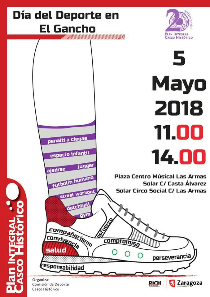 El Plan Integral del Casco Histórico celebra mañana, 5 de mayo, el "Día del Deporte en el Gancho". De 11.00 a 14.00 horas la plaza del Centro Musical Las Armas (plaza Mariano Cavia), el Estonoesunsolar de la C/Casta Álvarez y el solar del Circo Social en C/Las Armas acogerán las actividades deportivas programadas desde el PICH para fomentar la convivencia en el Casco Histórico.