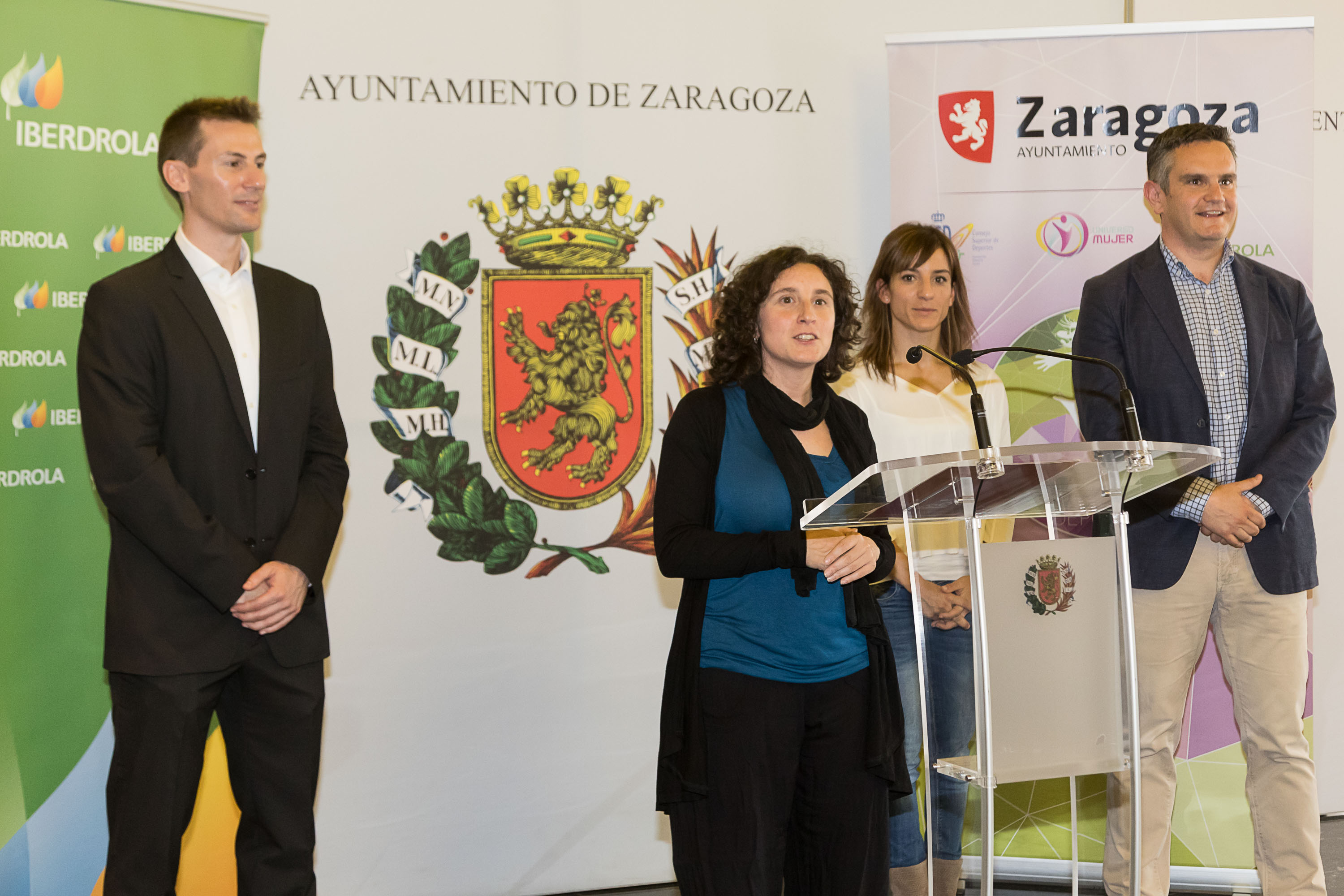 Durante la presentación del Tour Mujer, Salud y Deporte, la concejala de Educación e Inclusión, Arantza Gracia, acompañados por Carlos Corral, responsable de Iberdrola Clientes en Aragón, por la embajadora del programa Universo Mujer del Consejo Superior y Deportes y campeona del mundo de kárate, Sandra Sánchez, y el director de OÉOÉ Marketing, Ignacio Solana, han explicado el programa de actividades de esta edición. El acto ha contado también con la presencia de representantes de las 15 federaciones deportivas que participan en el evento.