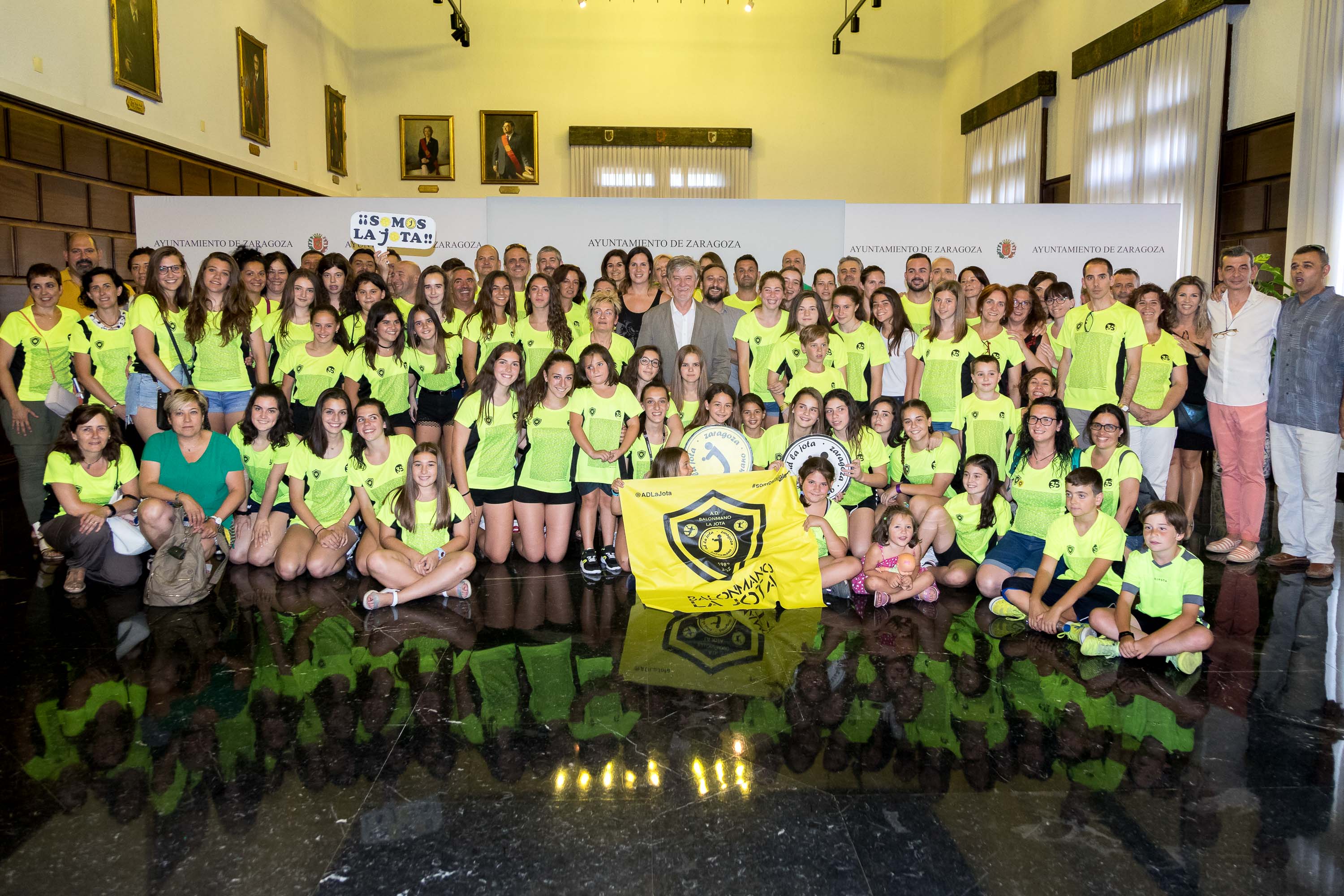 El alcalde de Zaragoza, Pedro Santisteve, y el concejal de Vivienda y Deporte, Pablo Híjar, han recibido hoy en el Ayuntamiento de Zaragoza a la Agrupación Deportiva La Jota Balonmano, que este año celebra su 35 aniversario convertido en un referente por su labor formativa de cantera, en particular en el ámbito del deporte femenino.