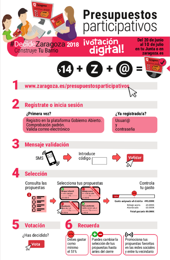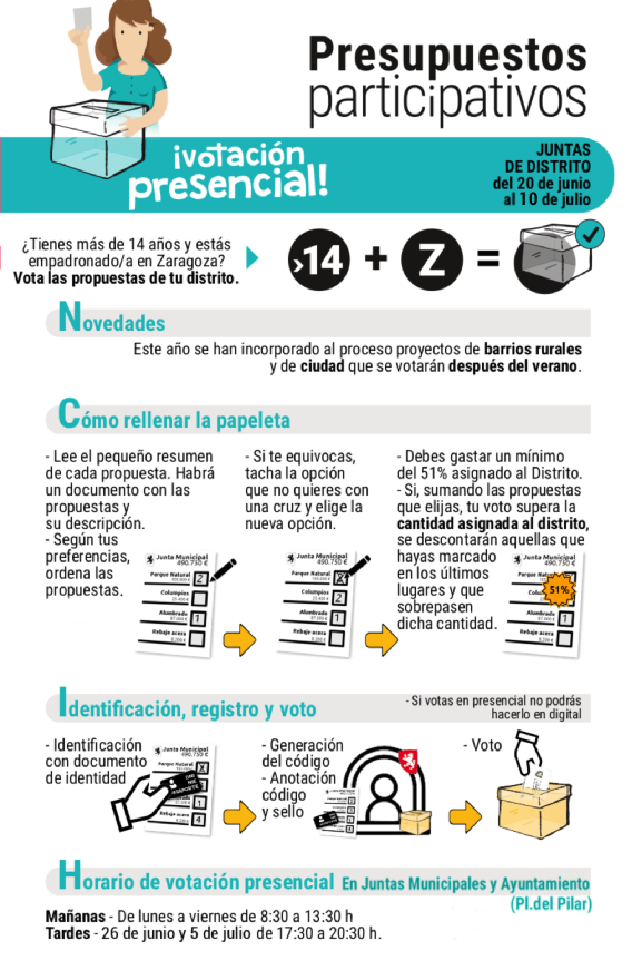 Como es sabido, las votaciones pueden realizarse de manera digital, a través de la Plataforma de Gobierno Abierto, o de manera presencial, en las Juntas de Distrito y en la sede del Ayuntamiento de Zaragoza en la Plaza del Pilar.