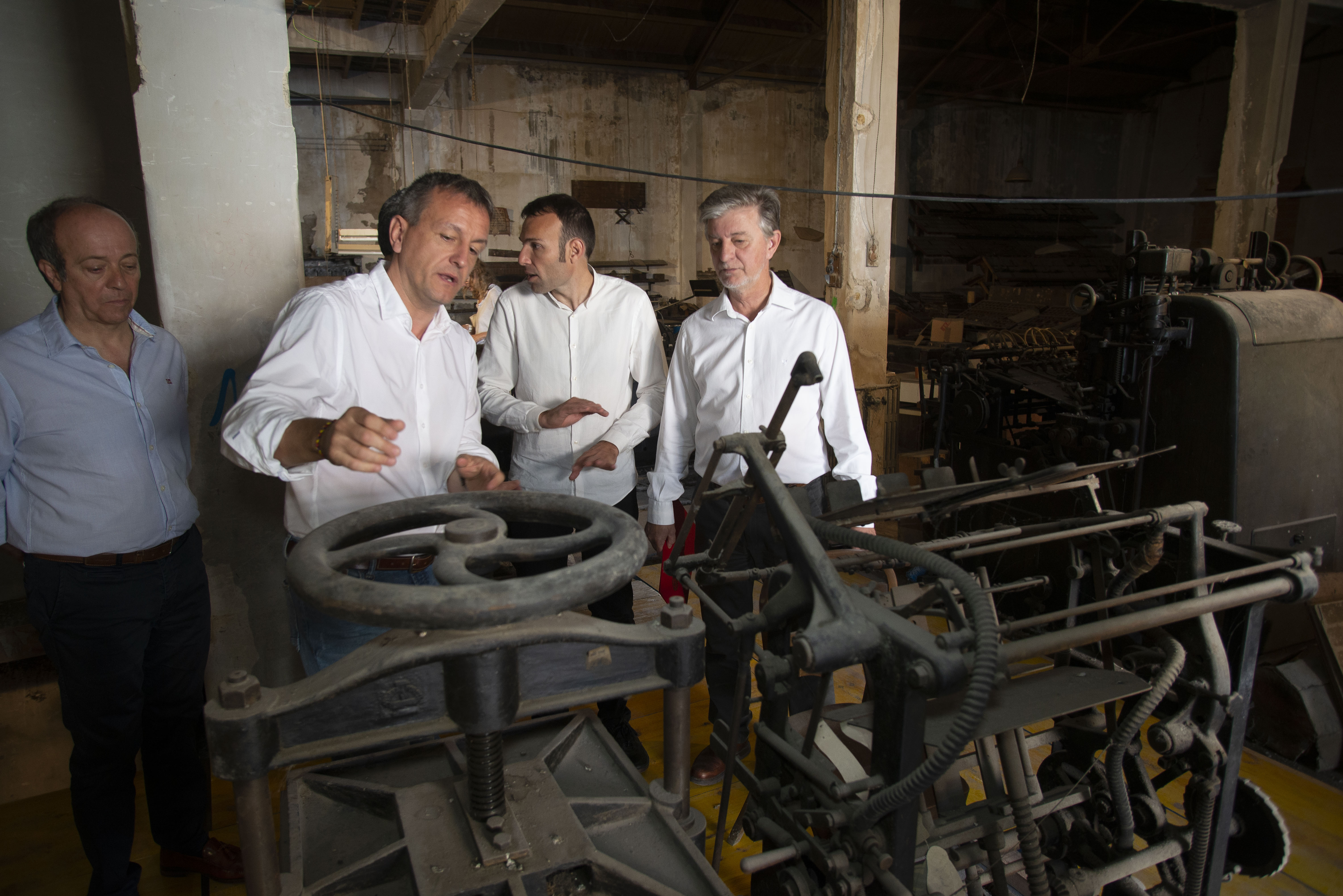 El Alcalde de Zaragoza, Pedro Santisteve, junto con los consejeros de Urbanismo y Cultura, Pablo Muñoz y Fernando Rivarés, ha visitado esta mañana la Imprenta Blasco para conocer los preparativos para su inminente rehabilitación y restauración de la maquinaria.