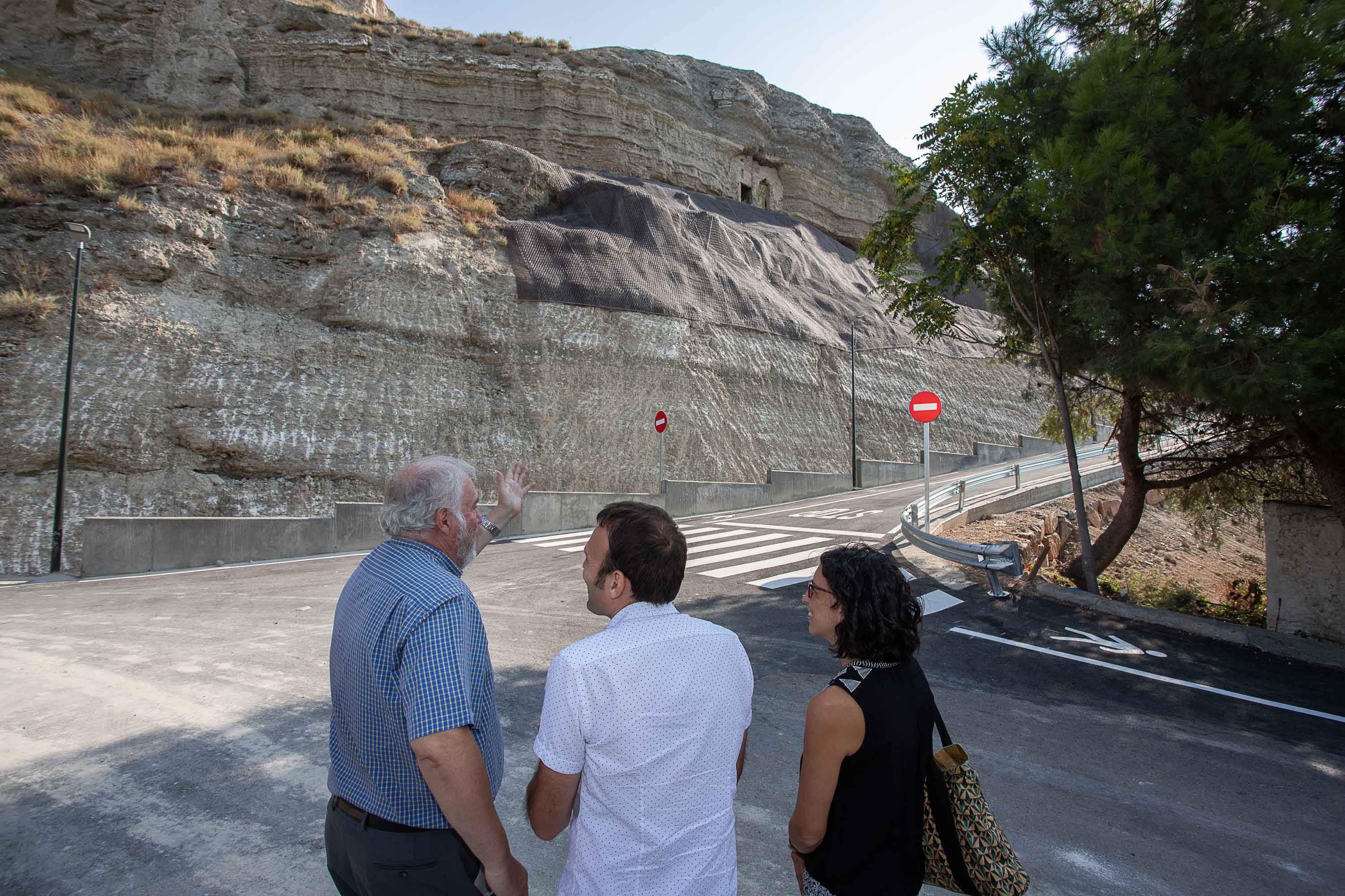 Cabe destacar que la actuación sobre el escarpe ha sido complementada con una obra de emergencia no prevista en el proyecto e imprescindible para garantizar la estabilización de la ladera. Dicha obra de emergencia se pudo realizar dentro del plazo de ejecución de la obra y fue asumida por el Ayuntamiento con un presupuesto final de 91.069,44 euros. En la obra de emergencia se han dispuesto, sobre el talud, mallas de triple torsión (hasta 1.373 m2), geomalla, red de cable de acero y 12 bulones pasivos de 8,0 m de longitud para sostenimiento de bloques en las viseras de las cuevas. Además de la protección del talud, se ha ejecutado un muro escalonado de 85 metros de longitud, con cuneta, con el fin de evitar la invasión de la calzada frente a pequeños desprendimientos y lluvias torrenciales.