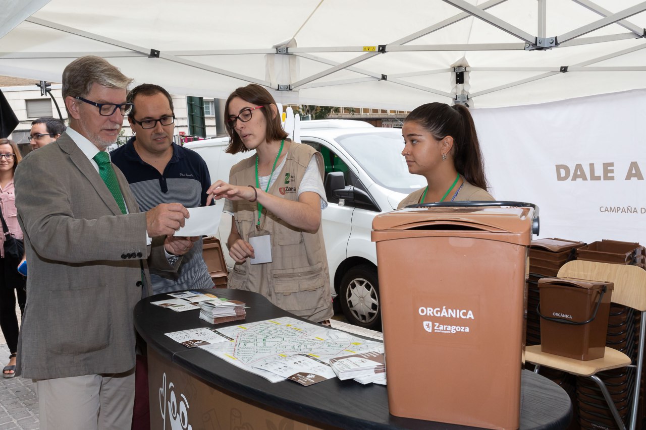 El Alcalde de Zaragoza, Pedro Santisteve, y el consejero de Servicios Públicos y Personal, han visitado el punto informativo de la campaña de recogida selectiva de materia orgánica en la modalidad puerta a puerta, la segunda fase de la prueba piloto que se está llevando a cabo en Zaragoza junto con la recogida en contenedores en el distrito del ACTUR.
