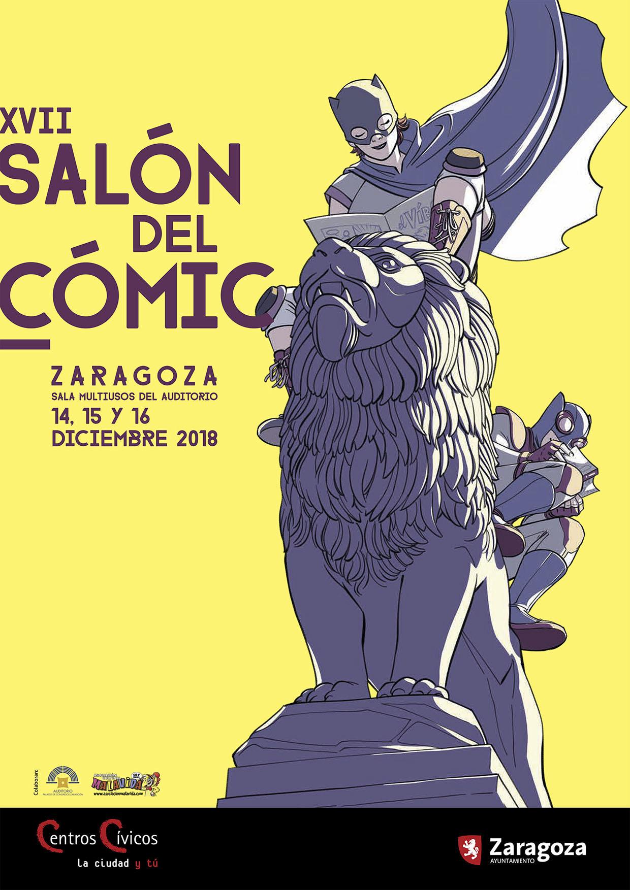 Esta tarde ha sido presentada la imagen del Salón del Cómic de Zaragoza, que celebrará su XVII edición del 14 al 16 de diciembre en la sala Multiusos del Auditorio. David López López es el autor del cartel del Salón, en el que ha querido representar "un elemento propio de la ciudad, como es el Puente de Piedra, junto a unos superhéroes que bien podrían ser también de Zaragoza".