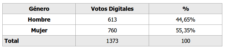 En cuanto a franjas de edad, el resultado es más homogéneo que en el caso de las votaciones en los distritos urbanos, con una mayoría de votantes de entre 41 y 50 años (29,5%) pero con una significativa presencia de votos de jóvenes de entre 14 y 30 años, que se acercan al 20% del total. (Este dato corresponde a las votaciones realizadas digitalmente). En cuanto a género, el número de mujeres participantes (760) supera al de hombres (613).