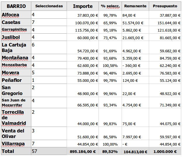 Este miércoles concluyeron las votaciones de los Presupuestos Participativos en los Barrios Rurales de Zaragoza, un proceso que se inició el pasado lunes 24 de septiembre y que se ha desarrollado de manera digital y presencial en 11 de las 14 Juntas Vecinales. Recordamos que las tres restantes, Monzalbarba, San Gregorio y Villarrapa, decidieron que, una vez ratificadas las propuestas viables por sus Plenos, no era necesario votar ya que se ajustaban al presupuesto máximo previsto para el barrio.