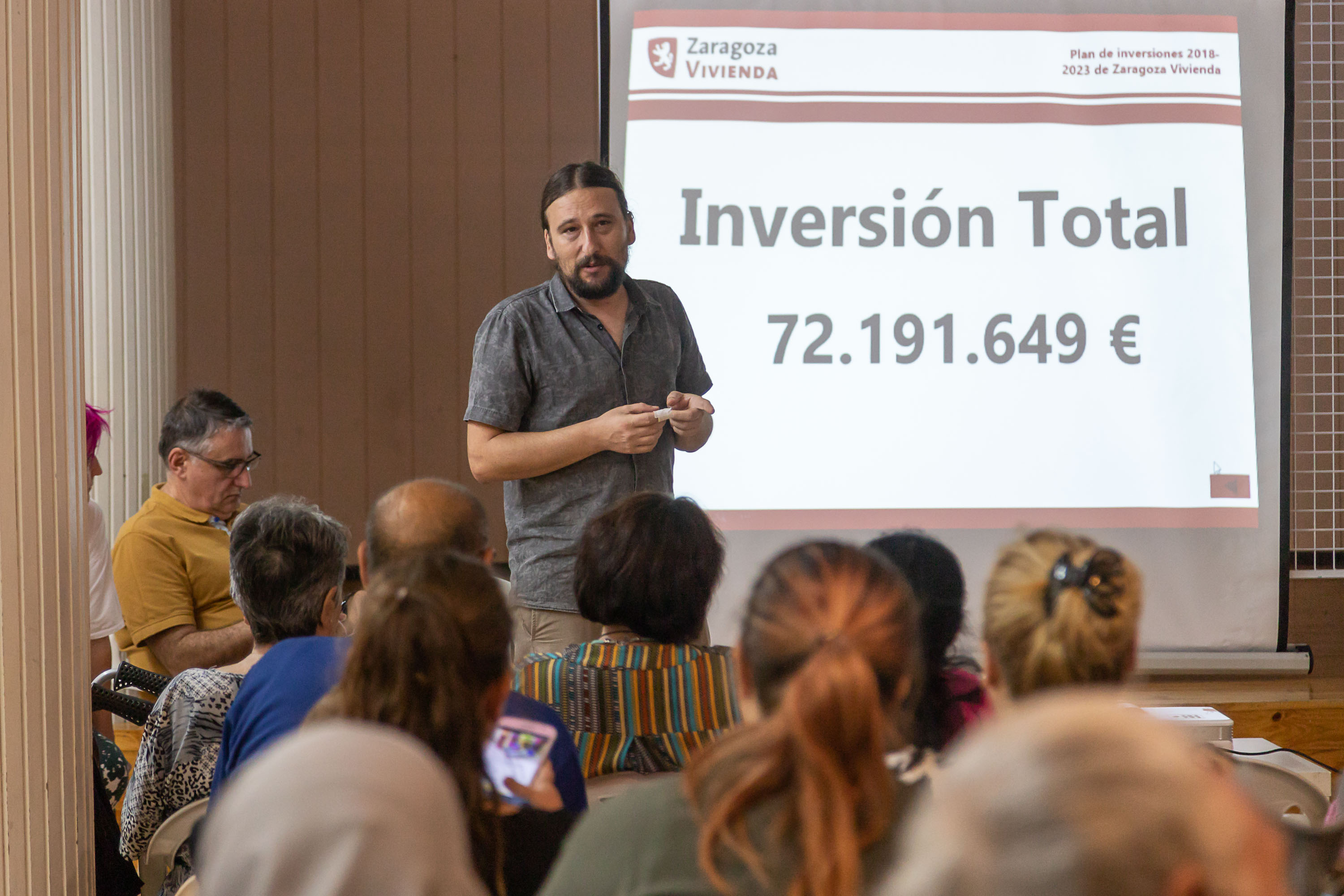 Vecinos y vecinas que actualmente residen en viviendas de alquiler social municipal en el Actur acudieron ayer a una asamblea informativa sobre el Plan de Inversiones en Vivienda 2018-2023, en la que también participó el concejal de Vivienda, Pablo Híjar y técnicos del Ayuntamiento. Esta iniciativa contempla la construcción de 308 nuevas viviendas en Las Fuentes, Valdefierro, Casco Histórico y Arrabal y la rehabilitación de un total de 842 inmuebles del parque público mediante una inversión de 72 millones de euros.