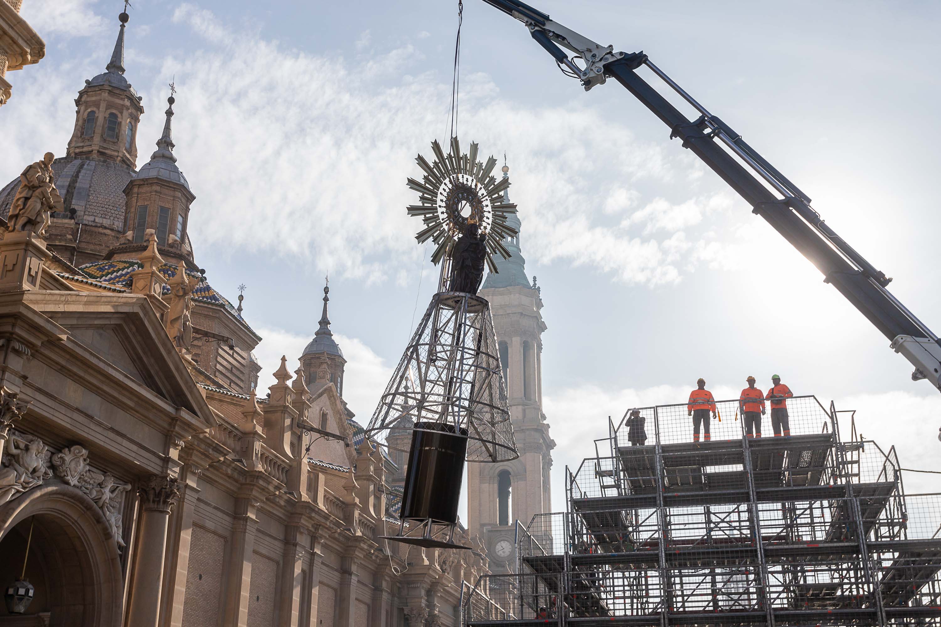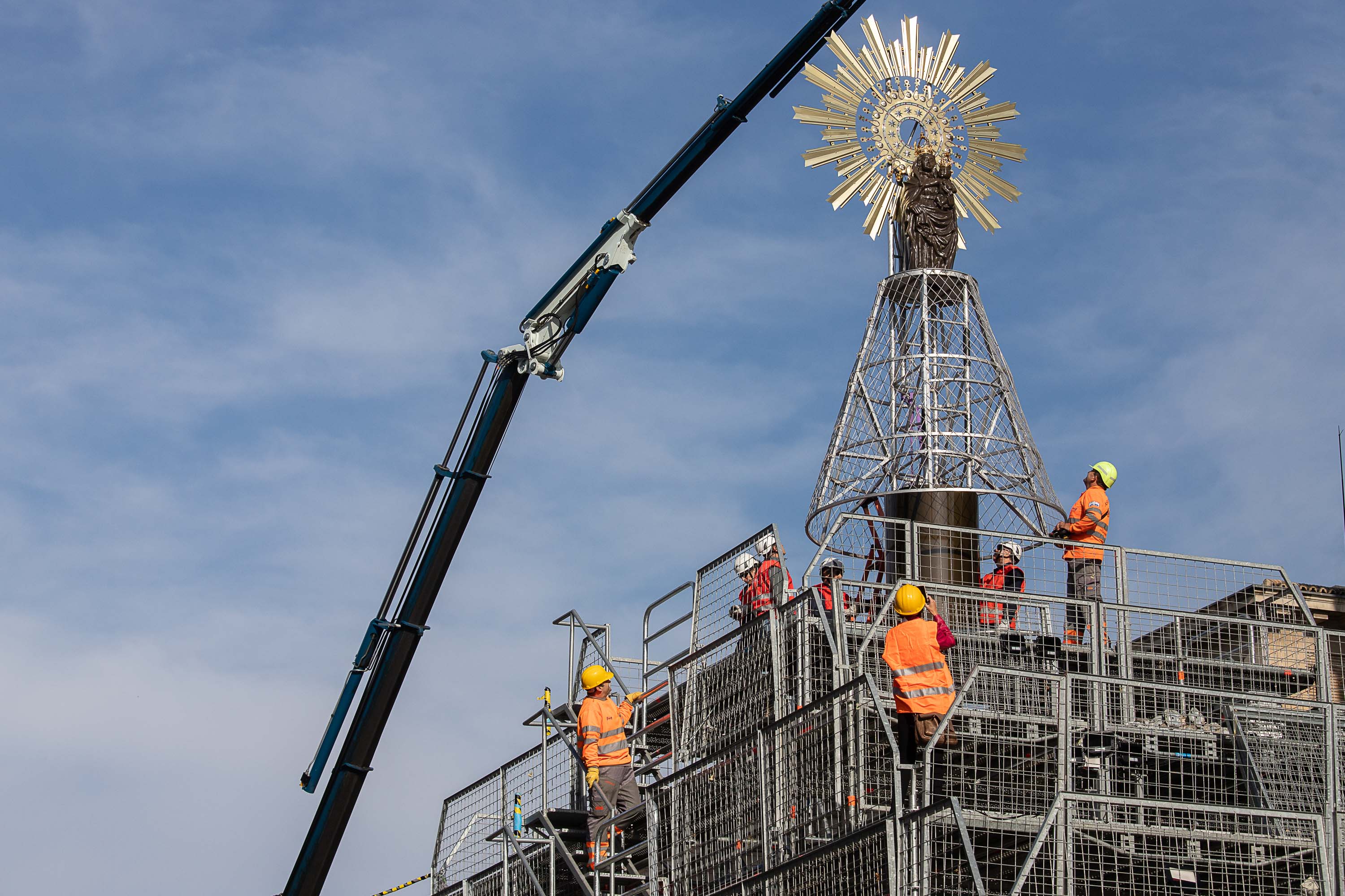 Esta mañana ha culminado el montaje de la estructura piramidal de la ofrenda, que tiene una altura de unos 15,50 metros, y la colocación de la imagen en la cúspide. La imagen de la Virgen mide 1,43 metros, pesa 15 kg y descansa sobre un troncopiramidal de 2,5 metros sobre el que se compondrá el manto, que este año se confeccionará con claveles de color rojo, al igual que la Cruz de Lorena, que será también roja con una aureola blanca para resaltarla.