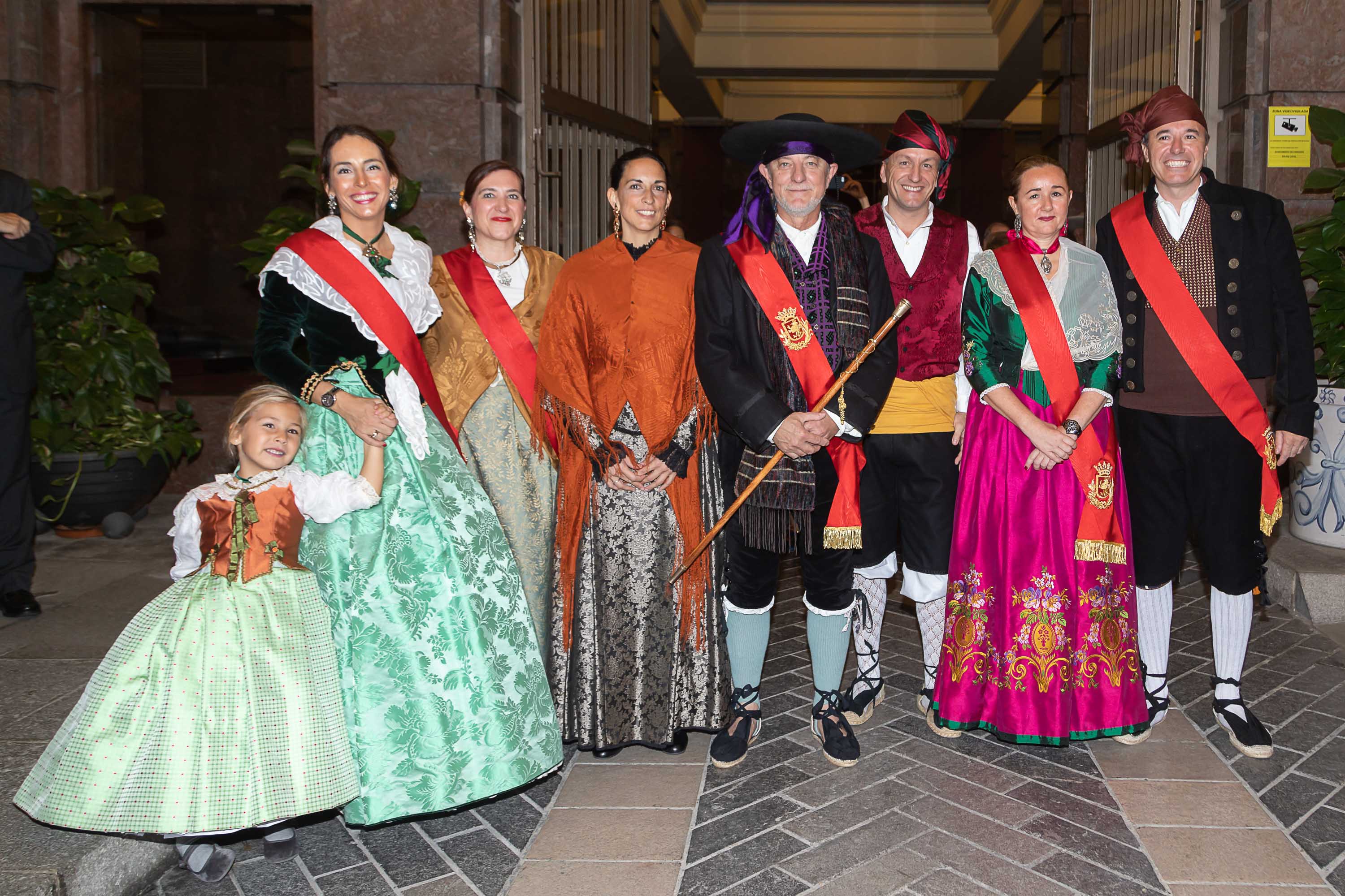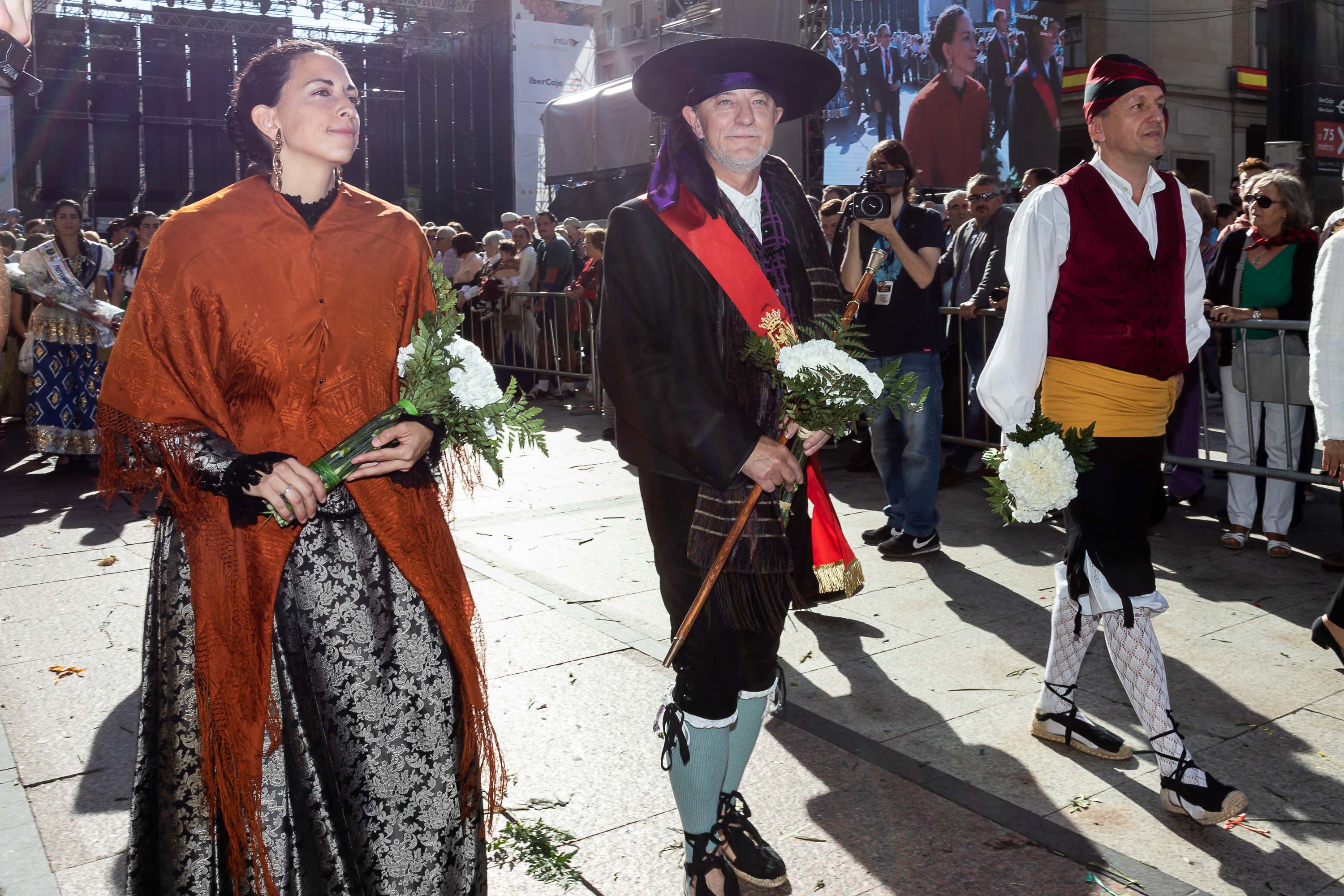 A las 11,30 del mediodía, la Corporación Municipal, encabezada por el alcalde, ha salido del zaguán del Ayuntamiento para realizar la Ofrenda a la Virgen. Algunos de los concejales y concejalas iban ataviados con el traje tradicional. El alcalde lucía un traje de muda, con elementos originales y antiguos, como la faja y el pañuelo, ambos de seda en color morado para hacer un guiño a las mujeres como protagonistas de estas fiestas del Pilar. Se completaba con un chaleco de carameletes y chupa originales. Ha estado ayudado y asesorado para lucir esta vestimenta por la profesorta de indumentaria aragonesa de la Escuela Municipal de Folklore, Conchi Millán.