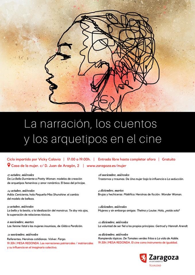 El Servicio de Igualdad del Ayuntamiento de Zaragoza presenta el ciclo impartido por Vicky Calavia 'La narración, los cuentos y los arquetipos en el cine'. Los miércoles del 17 de octubre al 19 de diciembre, la gestora cultural y documentalista Vicky Calavia imparte en la Casa de la Mujer de Zaragoza un ciclo de conferencias que mostrará cómo, en referencia al género, el cine ha bebido de la narración tradicional y ha reproducido arquetipos trasladados al imaginario colectivos a través del relato oral y los cuentos, que presentan a la mujer como elemento pasivo y receptivo, obediente y complaciente. Este ciclo examina y profundiza en esa imagen y su reverso y la evolución en la sociedad contemporánea.