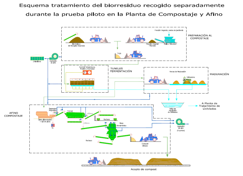 La materia orgánica que se recibe del piloto se mezcla con fracción vegetal triturada (normalmente restos de poda) y se envía a los túneles de maduración durante 15 días y posteriormente una maduración en parvas de 4 a 6 semanas para finalizar se somete a un afino para retirar pequeños trozos de impropios que pudieran haber pasado el pretratamiento previo.