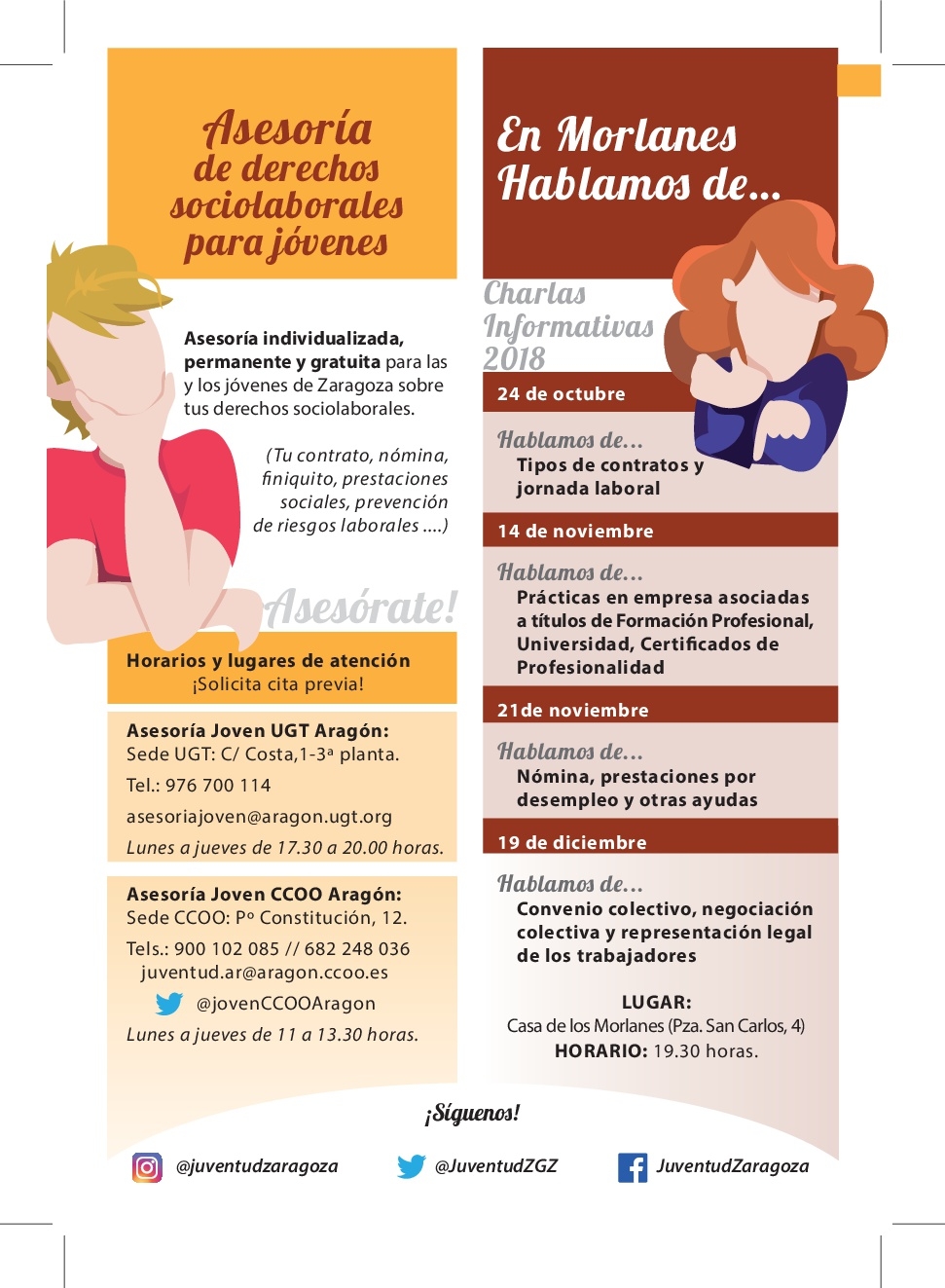 Los horarios serán de lunes a jueves de 11 a 13,30 horas en la sede de CCOO Aragón (Paseo Constitución, 12) y de 17,30 a 20 horas en UGT Aragón (Costa, 1, 3ª planta). Será necesario concertar cita previa, para los horarios de mañana en los teléfonos 900 102 085 y 682 248 036 o en el correo electrónico juventud.ar@aragon.ccoo.es y en el 976 700 114 o asesoriajoven@aragon.ugt.org para los horarios de tarde.