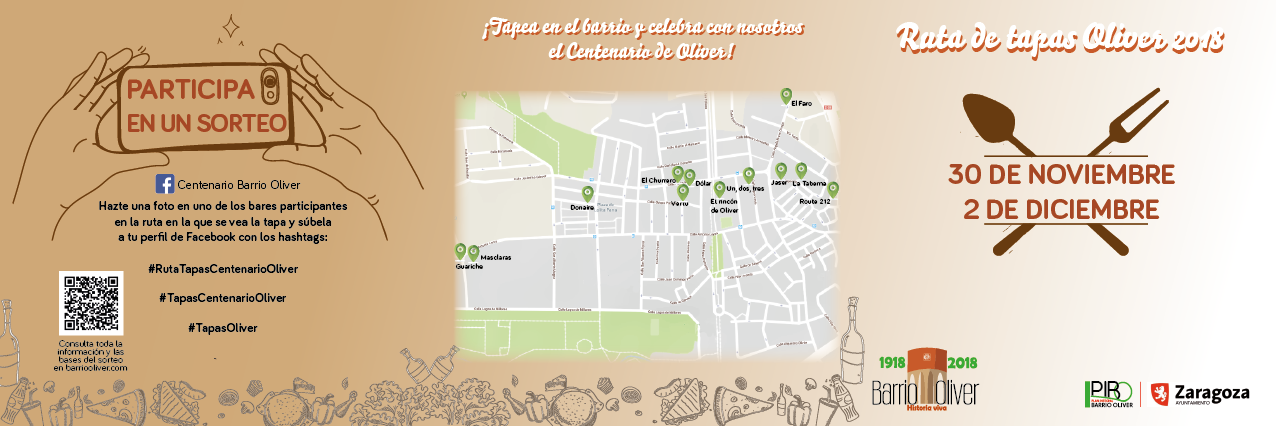 El Barrio de Oliver continúa con las celebraciones de su Centenario, que se cumple este año. En colaboración con el Plan Integral del Barrio Oliver, PIBO, y el Ayuntamiento de Zaragoza, las asociaciones integrantes de la organización del Centenario proponen, para este fin de semana, una Ruta de Tapas por Oliver, que se celebrará del 30 de noviembre al 2 de diciembre en una docena de establecimientos del barrio.