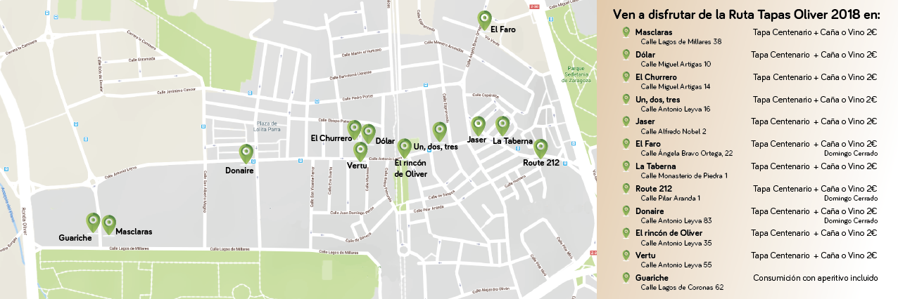 Los bares participantes son Masclaras (Calle Lagos de Millares, 38), Dólar (Calle Miguel Artigas, 10), El Churrero (Calle Miguel Artigas, 14), Un, dos, tres (Calle Antonio Leyva, 16),  Jaser (Calle Alfredo Nobel, 2), El Faro (Calle Ángela Bravo Ortega, 22 -el domingo estará cerrado-), La Taberna (Calle Monasterio de Piedra, 1), Route 21 (Calle Pilar Aranda, 1), Donaire (Calle Antonio Leyva, 83 -el domingo estará cerrado-), El Rincón de Oliver (Calle Antonio Leyva, 35), Vertu (Calle Antonio Leyva, 55) y Guariche (Calle Lagos de Coronas, 62).