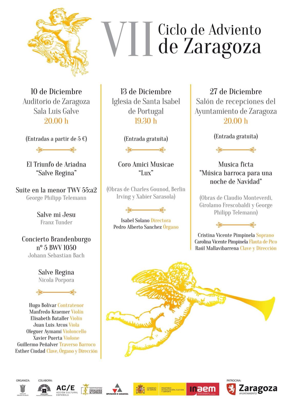 El VII Ciclo de Adviento de Zargoza está organizado por la Fundacion Hernando de Aragón, con el patrocinio del Ayuntamiento de Zaragoza y la colaboración de Acción Cultural AC/E por su ayuda en el programa Pice, del INAEM, de la Diputación Provincial de Zaragoza, de la Institución Fernando el Católico y el Auditorio de Zaragoza.