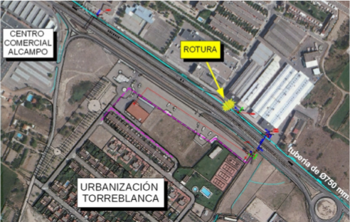 La rotura se ha producido en una tubería de 750 mm. de diámetro que discurre por la Carretera Nacional 232 (carretera de Logroño), a la altura de la Urbanización Torreblanca. Se trata de una tubería arterial de hormigón armado con camisa de chapa. El próximo miércoles día 23 de enero, a primera hora de la mañana se tiene previsto acometer las obras de reparación de la rotura. Por ello se producirá un corte en el suministro de agua que afectará principalmente a la población de Utebo, a los barrios de Casetas, Garrapinillos y áreas industriales adyacentes. En el caso de una menor duración de la reparación, se repondrá el servicio antes de ese plazo.