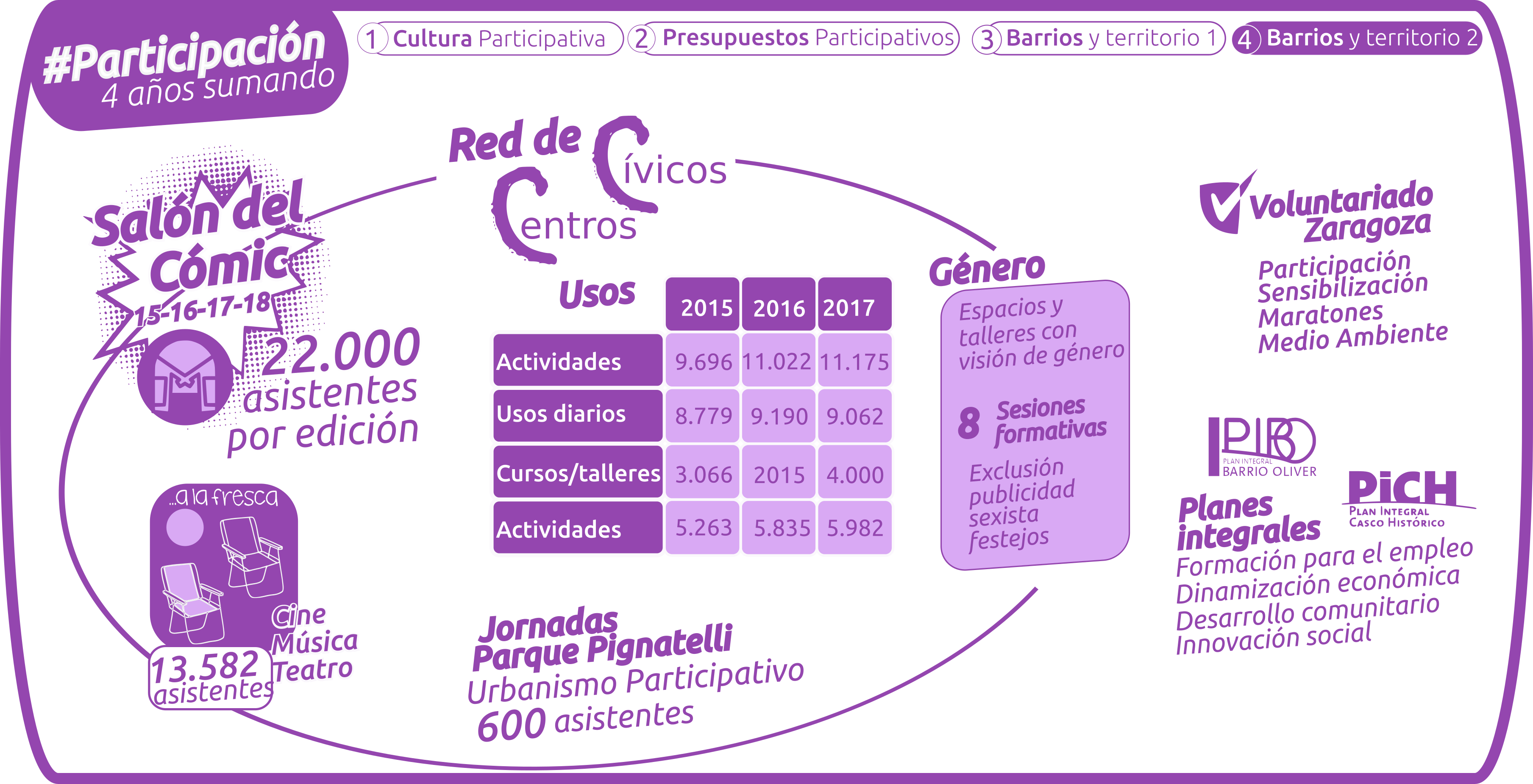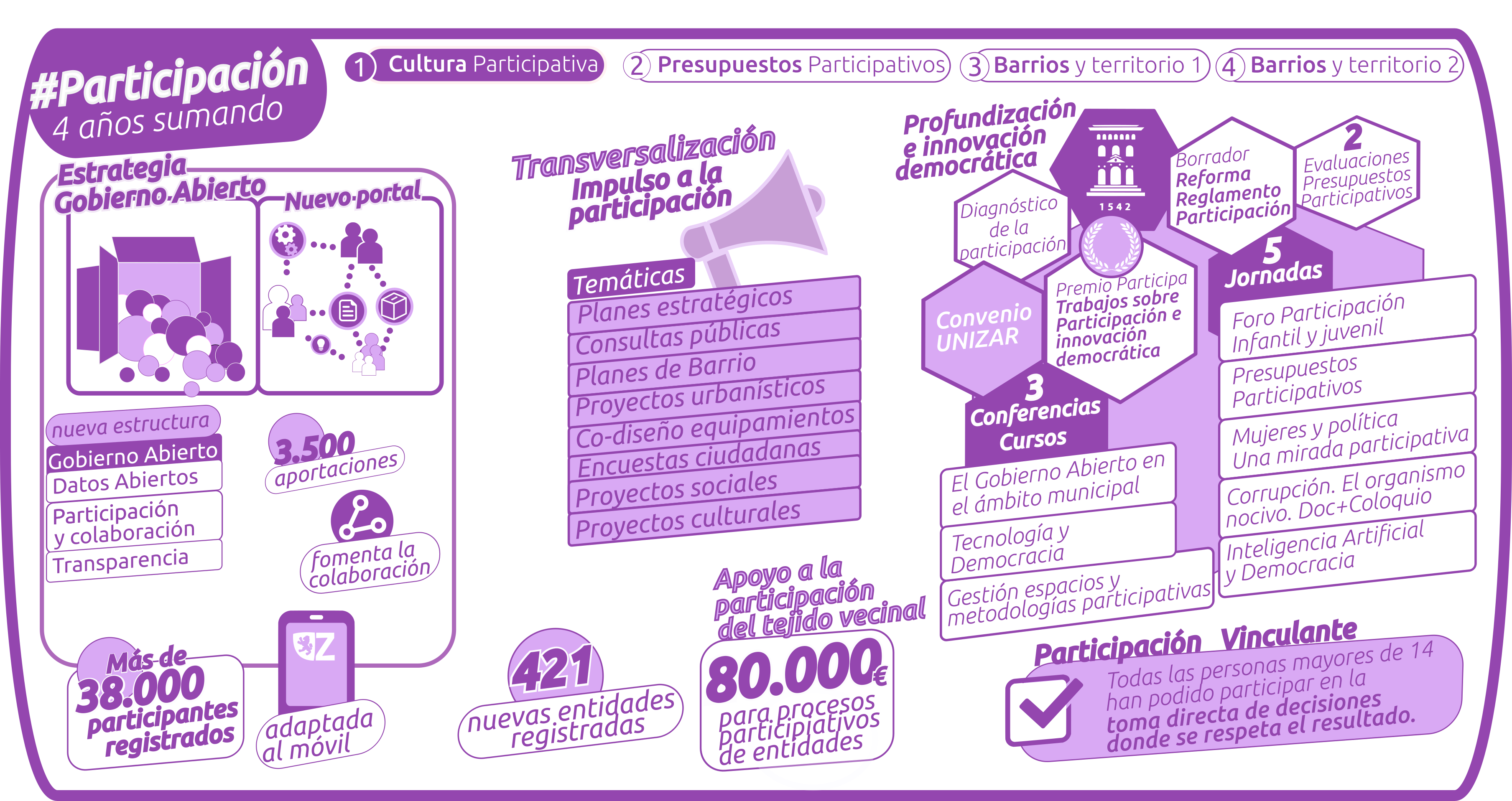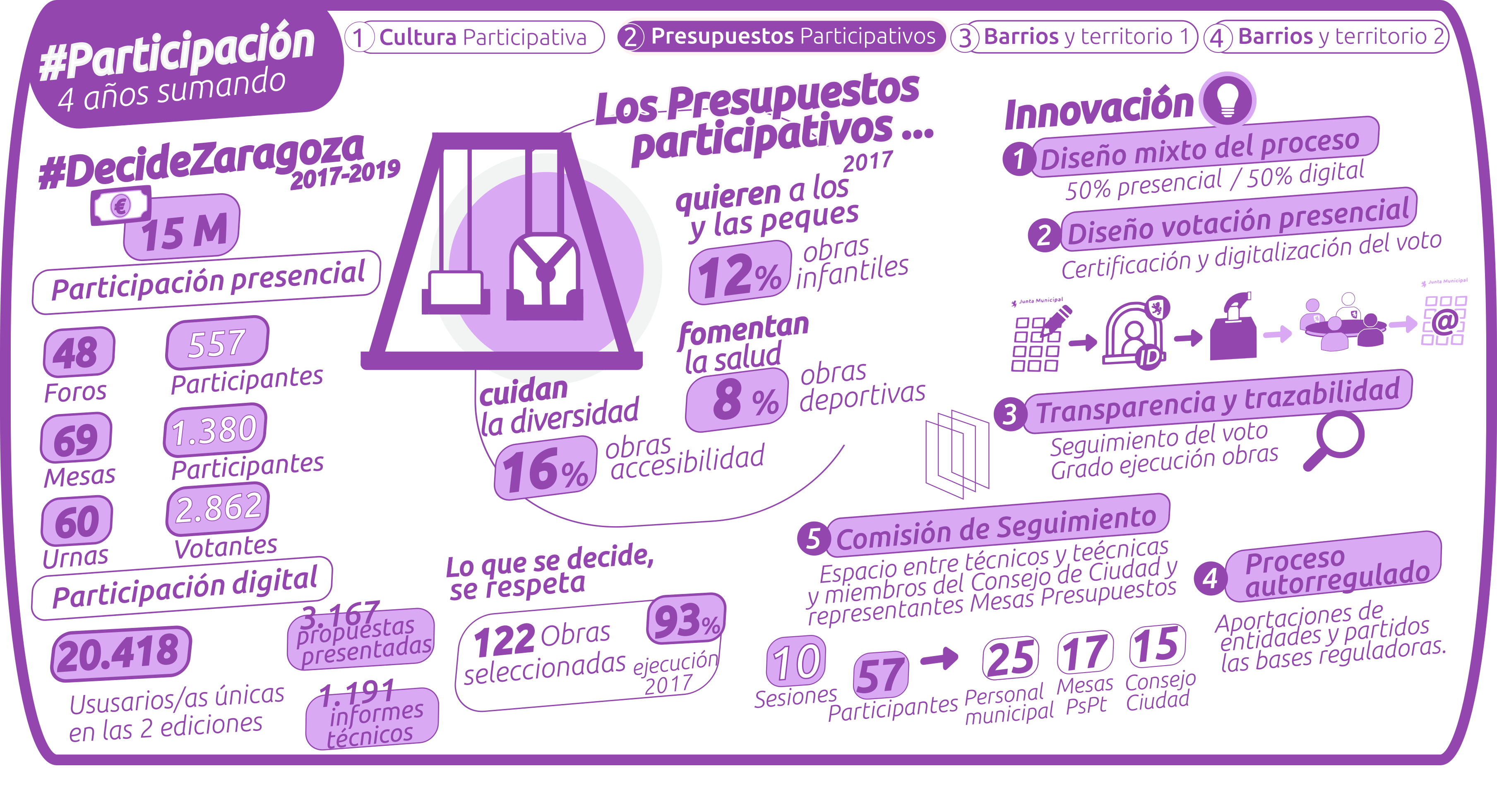La mayor parte de la atención política, mediática y ciudadana se la han llevado, cómo no, los Presupuestos Participativos, una experiencia que ha supuesto un antes y un después en la manera de entender la toma de decisiones desde un municipio como Zaragoza en relación con su ciudadanía. Los zaragozanos y zaragozanas han decidido sobre el destino de 15 millones de euros a lo largo de las dos ediciones realizadas, lo que supondrá la ejecución de más de 300 obras, de todos los tamaños y en todos los ámbitos y áreas municipales.