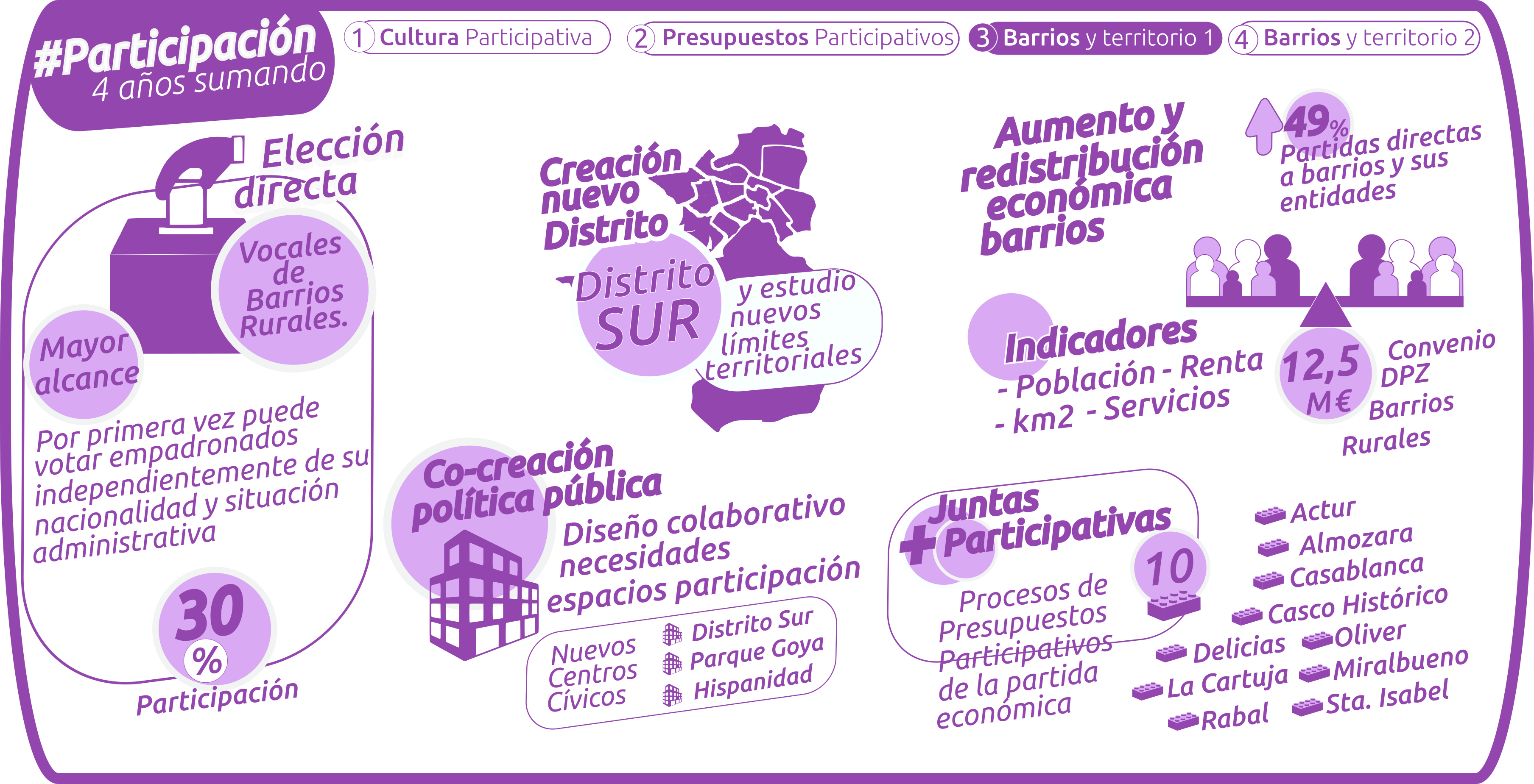 Desde el Área de Participación, Transparencia y Gobierno Abierto se han puesto en marcha decenas de iniciativas novedosas, como la elección directa de vocales de las Juntas Vecinales en los Barrios Rurales a un serio trabajo en la redefinición de límites de algunos distritos o la aplicación de criterios objetivos en la distribución de partidas en las Juntas, pasando por la creación de un nuevo distrito, el Distrito Sur, o la implantación de nuevas líneas de ayudas al tejido asociativo.