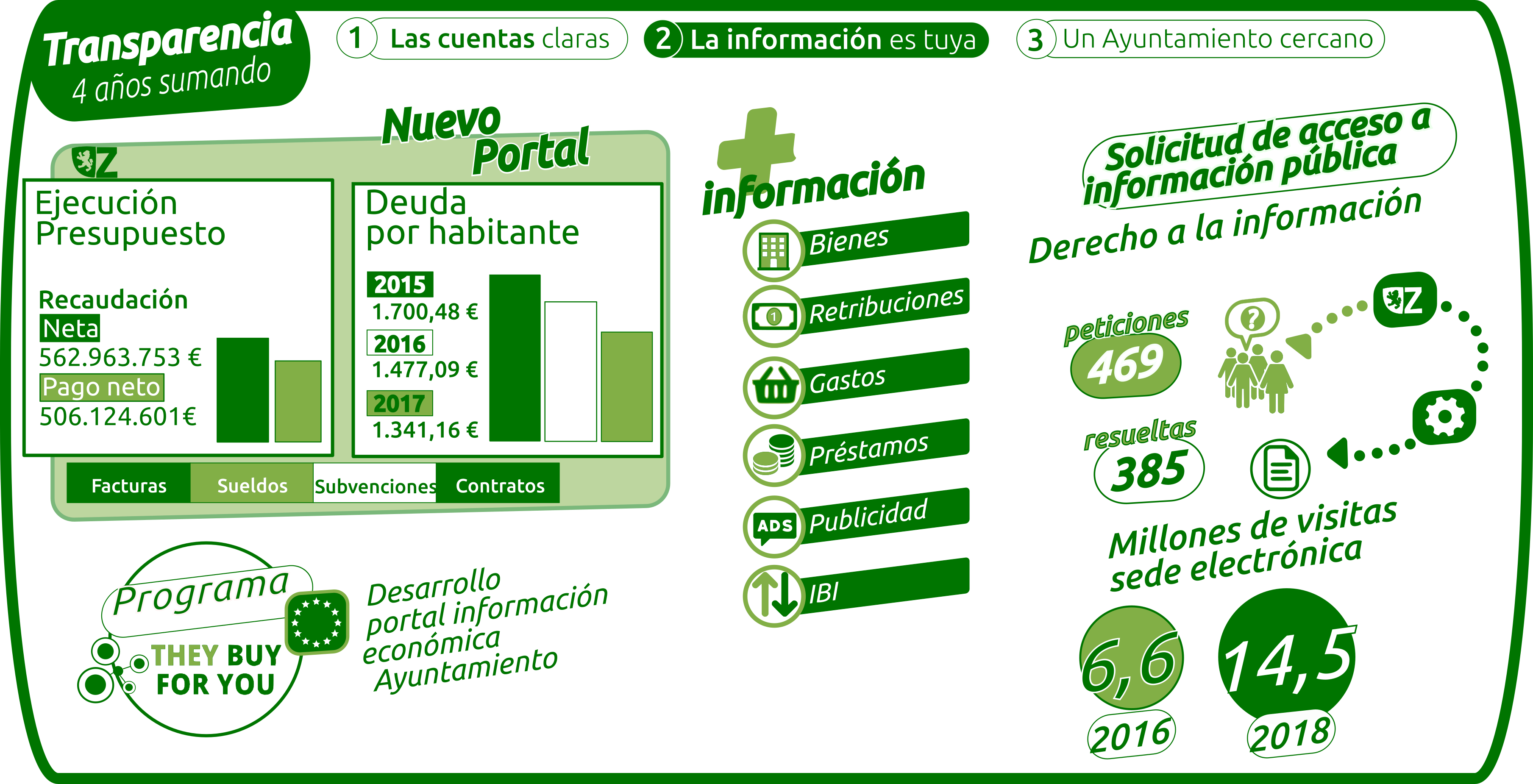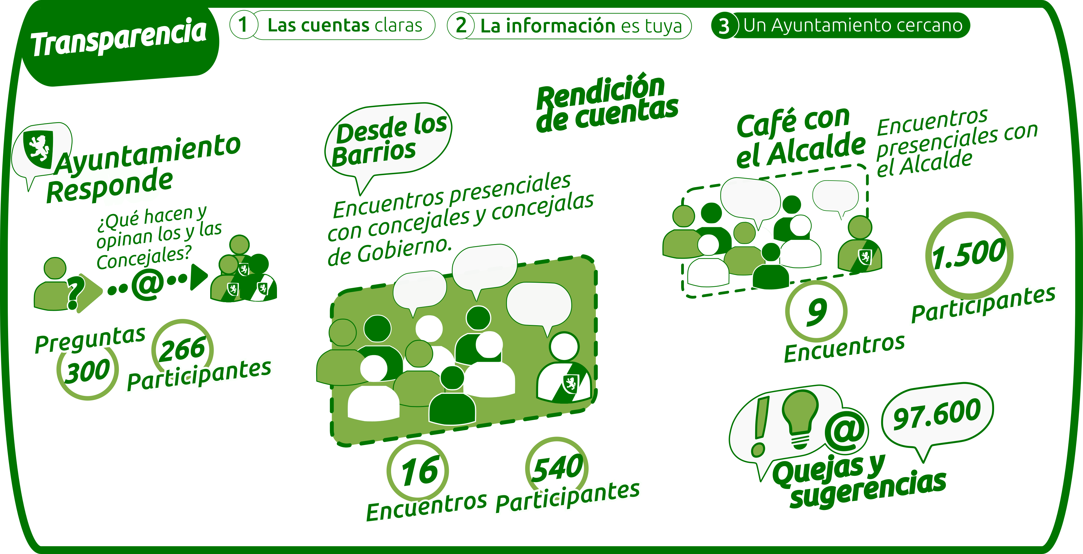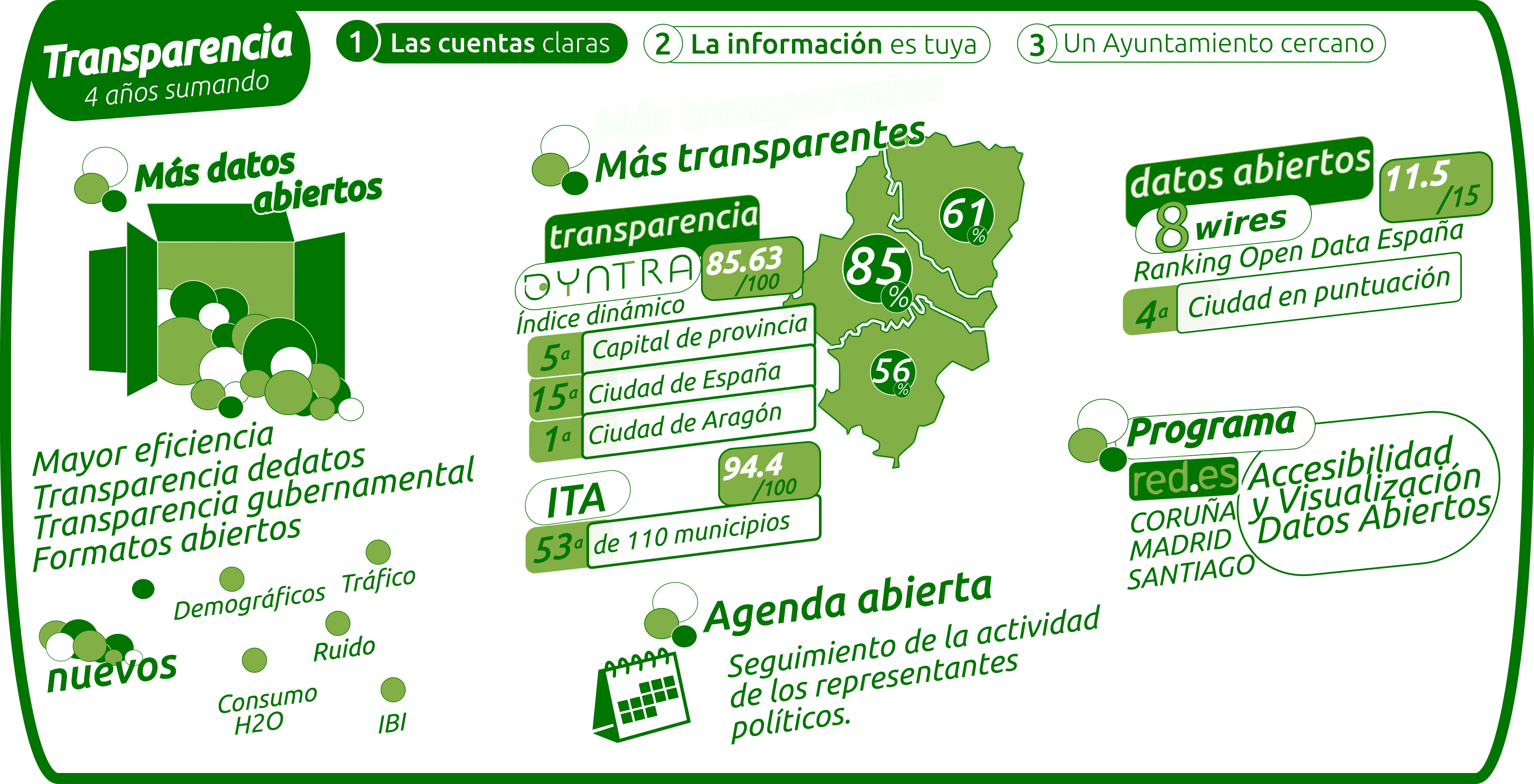 La Transparencia es la tercera columna sobre la que han pivotado las prioridades del Área. Si Zaragoza ya tenía "buenas notas" en este ámbito, se ha trabajado para profundizar en este camino. Así, se han puesto en marcha distintas propuestas relacionadas con la rendición de cuentas de manera digital y presencial, como Ayuntamiento Responde, Desde los Barrios o el Café con el Alcalde.