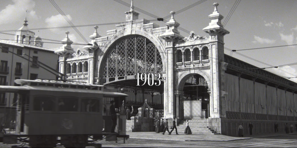 En apenas un minuto y medio, el edificio de Félix Navarro permanece como escenario de la historia de Zaragoza pero los puestos, los productos, la clientela, la movilidad del entorno van variando en función de la etapa histórica. Se puede contemplar como a principios del siglo XX el proyecto original partía de una amplia nave, recreándose en los detalles de forja o de esmaltes. El viejo tranvía o los vehículos de tracción animal también se representan, así como los cerramientos laterales originales, mediante cortinas de lona.