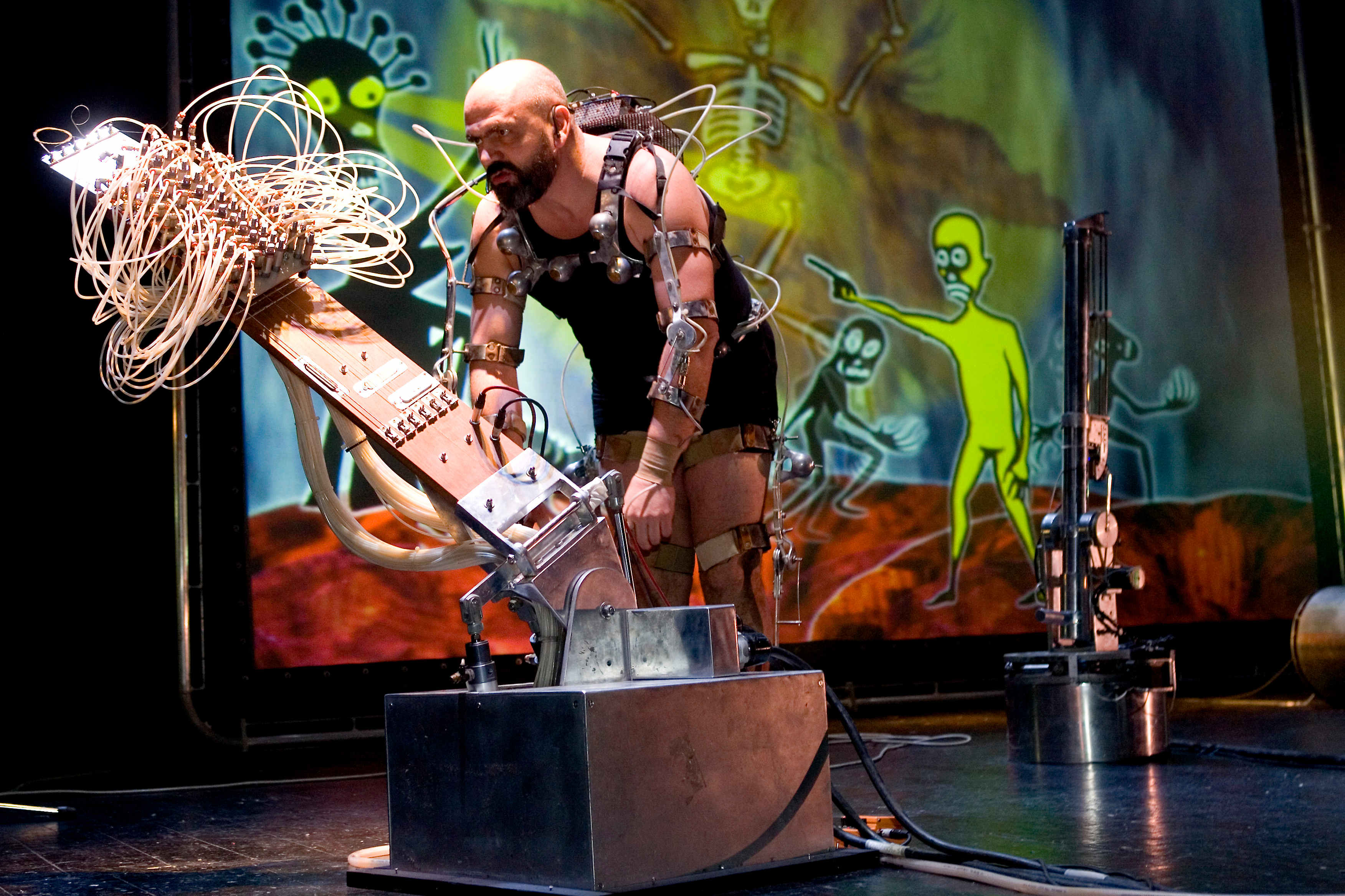 Este show se realizará en formato de conferencia mecatrónica, para lo cual Antúnez se servirá -entre otros dispositivos tecnológicos con los que articulará la presentación- de su dreskeleton, un exoesqueleto robótico; o de Matías, la réplica robótica de su cabeza.