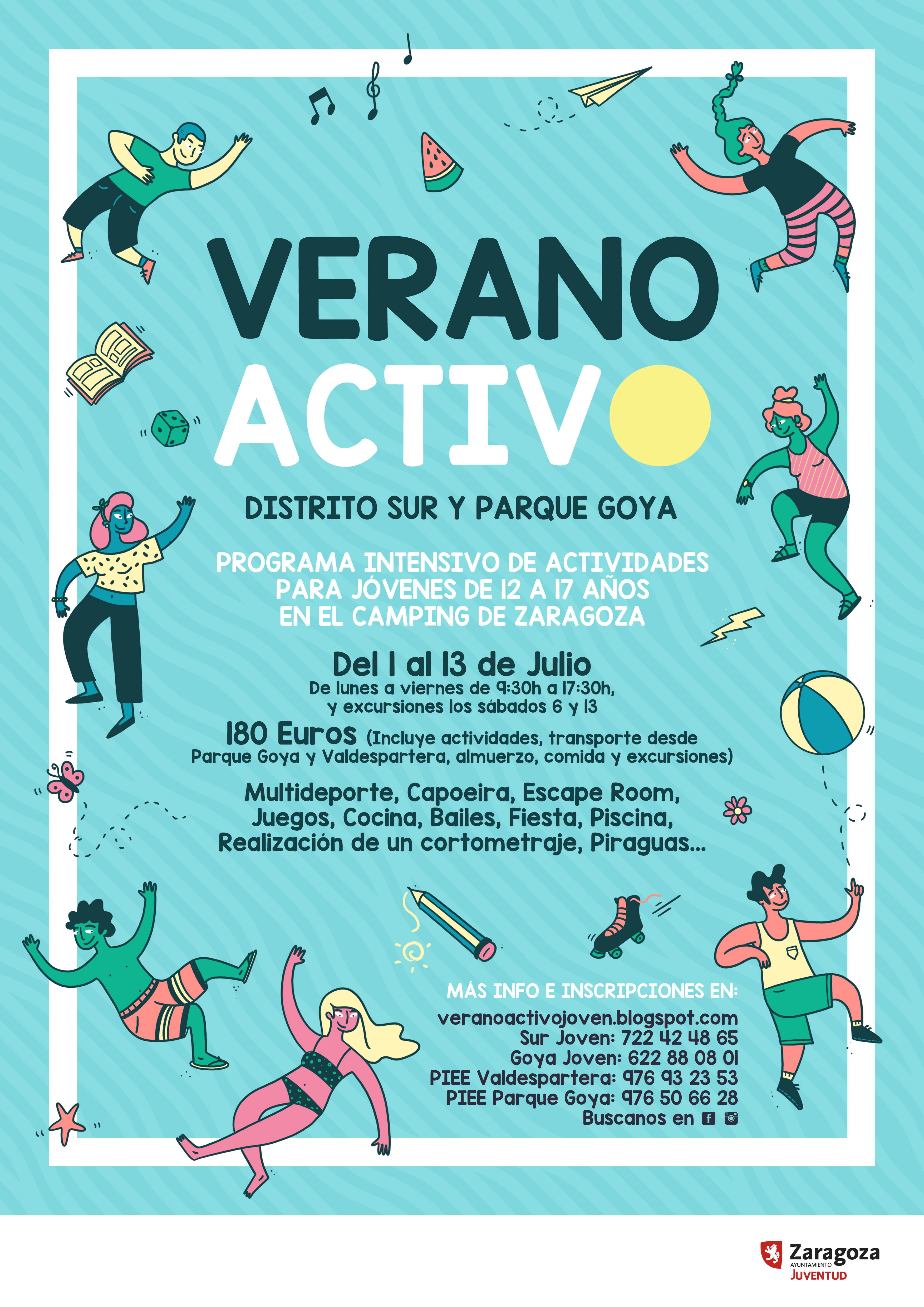 El Ayuntamiento de Zaragoza ha abierto el plazo de inscripciones para Verano Activo, la colonia-campus urbano que por tercer año organiza el Servicio de Juventud en el camping municipal del 1 al 13 de julio. Se trata de una iniciativa dirigida a adolescentes de 12 a 17 años, para facilitar la conciliación familiar de lunes a viernes en horario de 9.30 a 17.30 horas y con excursiones los sábados 6 y 13 de julio.